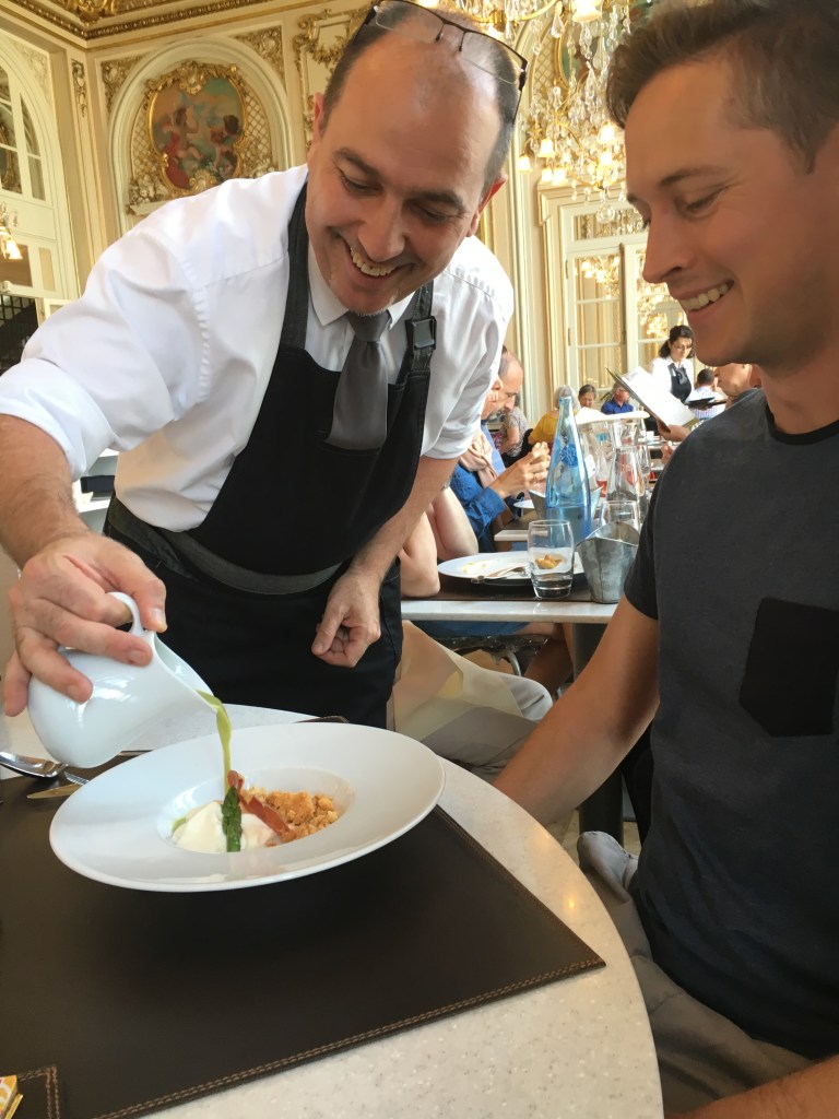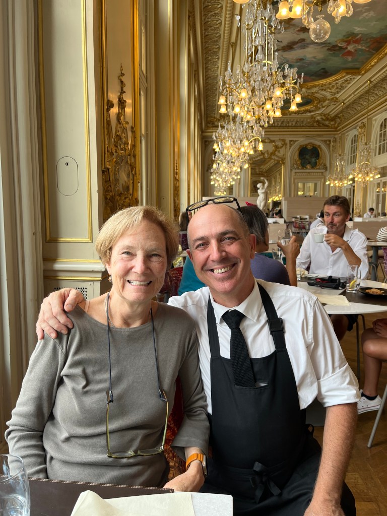 In 2018 David, Byron and I ate at the Musee D’Orsay Restaurant. The waiter made quite an impression serving Byron’s asparagus soup. Today, Valerie and I went to the same restaurant on our first day in Paris. Our waiter was very nice so I showed him the photo from 2018. A few minutes later he returned to our table with Frederick – the same waiter as 2018!! He hasn’t changed a bit.