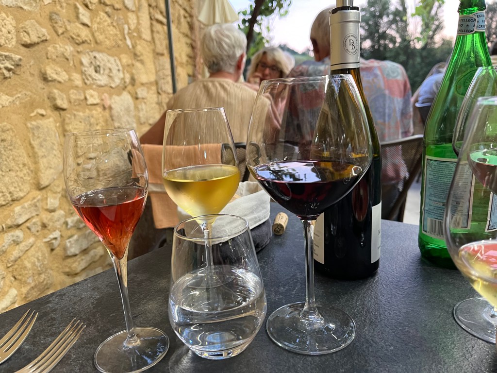 Four drinks with dinner. Kir Royale for starters, Monbazillac for the fois gras appetizer, Mercurey for the lamb, and water for our health.
