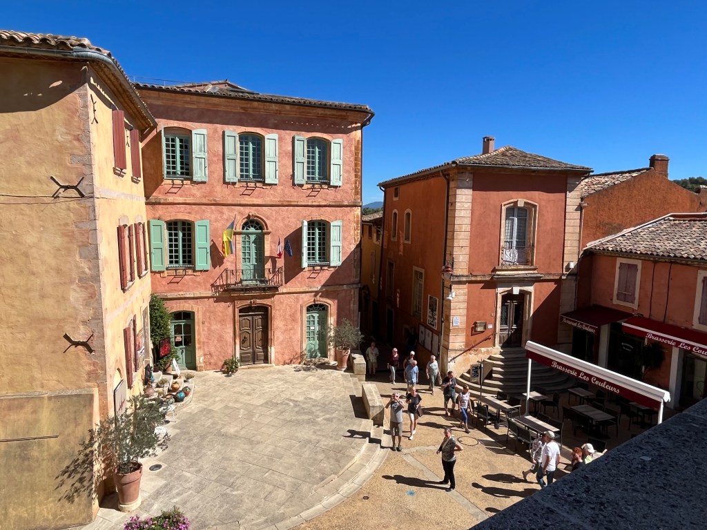 Valerie and I headed out to the Luberon – a hilly area of Provence. We looked at the various villages/hill towns and selected Roussillon. Nearby was a famous cave (vineyard) where we planned to buy some reds to have for our guys when they arrived the next day. It was a nice day and it is a charming place with lovely red cliffs. Roussillon sits on the world’s largest ocre deposit and used to be the European ocre capital.