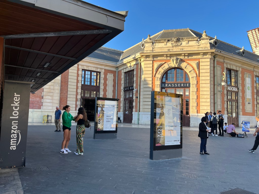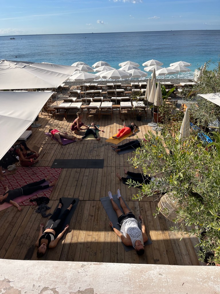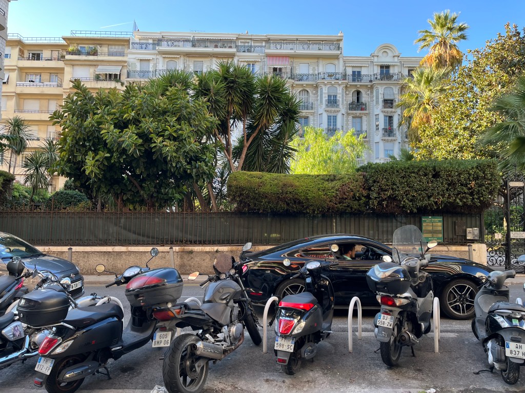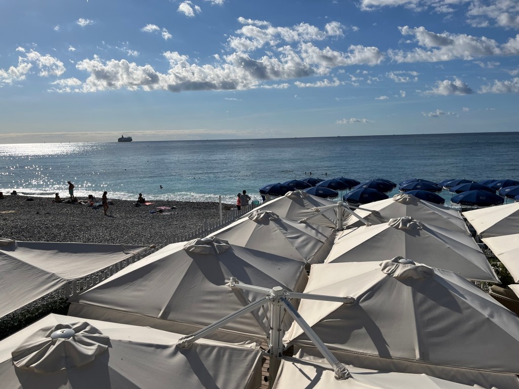 David and I took off early for a very full day in Nice. We started with The Promenade des Anglais (the English promenade). On one side is the beach and the other is the main road in front of hotels and casinos. The quite wide paved walk serves running races, families with strollers, bathers and sun catchers, yoga and HIIT classes, the works. There were sections of private beach with loungers and umbrellas and restaurants. Other – public – sections had not of that but cost nothing, The beach is rocky – not sand. So, the chaise loungers with umbrellas seems most inviting. We saw people lined up at 10 am, waiting for the private sections to open.