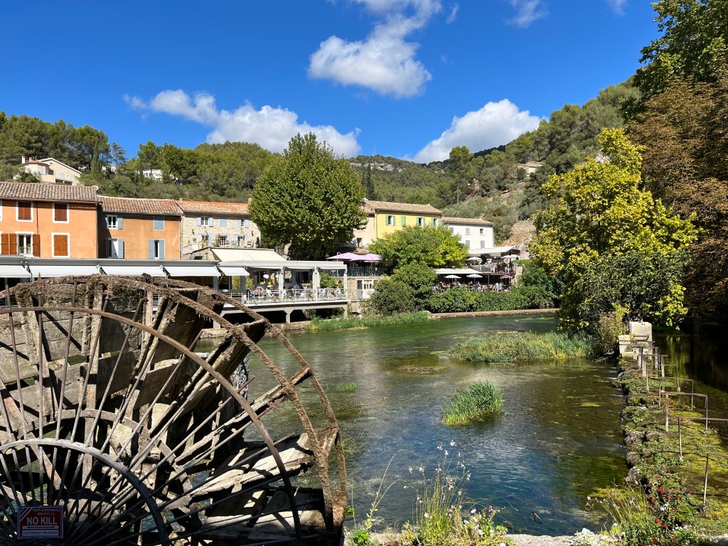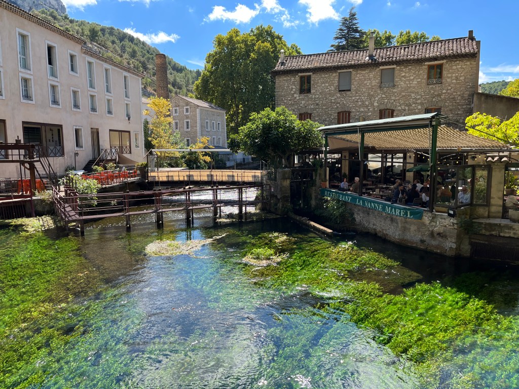Leaving Vison for Marseille and leaving France. We had planned to stop in Isle-sur-la-Sorgue on our way to Marseille but realized that it was antique market day and would be mobbed – traffic, no parking. So, we decided to go to Fontain-de-Vaucluse instead. As we entered town and saw the green river David and I realized that this is the spot we visited many years ago. Bernadette took us there so that Byron and David could kayak. There are restaurants lining the banks for pleasant dining with the sound of water.