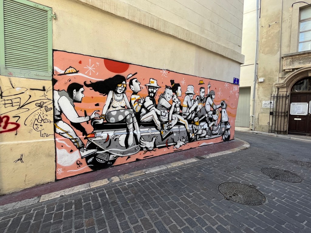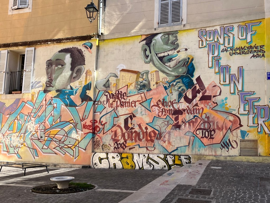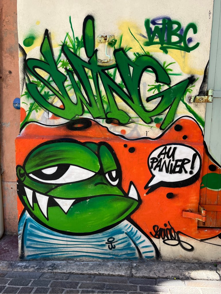 We had a day in Marseille before our 7:50 flight to Sicily. We returned to the cathedral to see inside as well as the outside. Then we walked through the old town before going back to our hotel for our bags. The cathedral is very impressive. The amount of expense and artistic energy put into such places is remarkable. The old town is full of grafitti. It reminds me of the street in Melbourne that has wonderful graffiti that is changing all the time. In Marseille, it is not just one street/alley. It is throughout the old town. Colorful but somehow cheapening the old neighborhood and turning the old charm into something cheap.