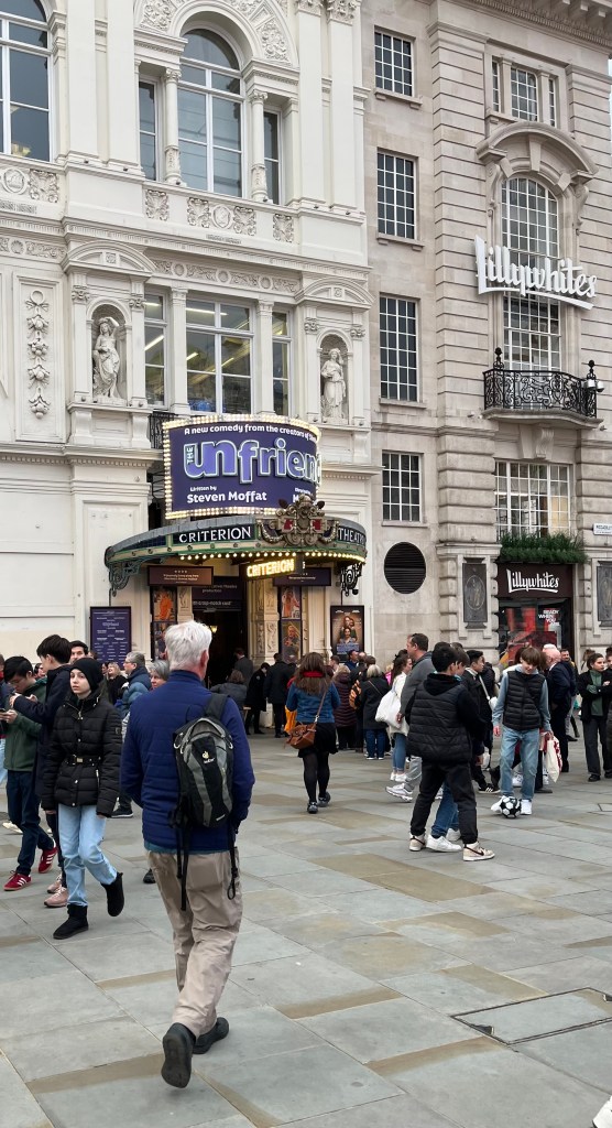 And we have a delicious meal, especially as we can look at the window in front of us at people in a wet cue for something or other. After dinner, we dodge raindrops to arrive at the Criterion Theater where Unfriend unfolds before us. A terrific, witty, well acted and produced comedy that lifts our spirits so much we ignore the wind, rain, wet, and cold return to our hotel.