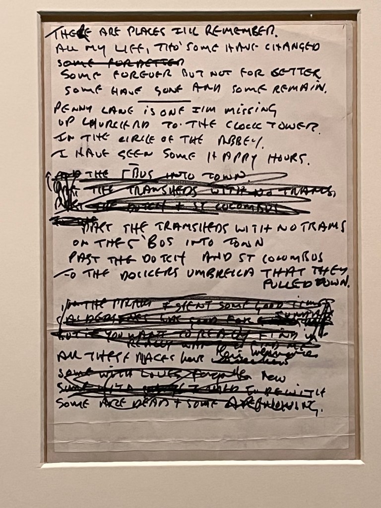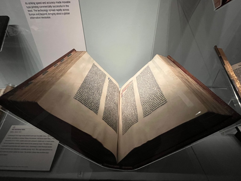 A bit of smoked salmon for Cynthia and a G&T for David prepared us for the windy but remarkably dry trip to the British Library in the afternoon. Where else can one see the Magna Carta (five made, a few destroyed by time and incompetent restorers), the first printed book of the Bard’s complete works, put together by his friends, a smattering of original musical scores by Mozart and Hayden, Monty Python scripts by Michael Palin, and hand-written lyrics of Beatles songs.