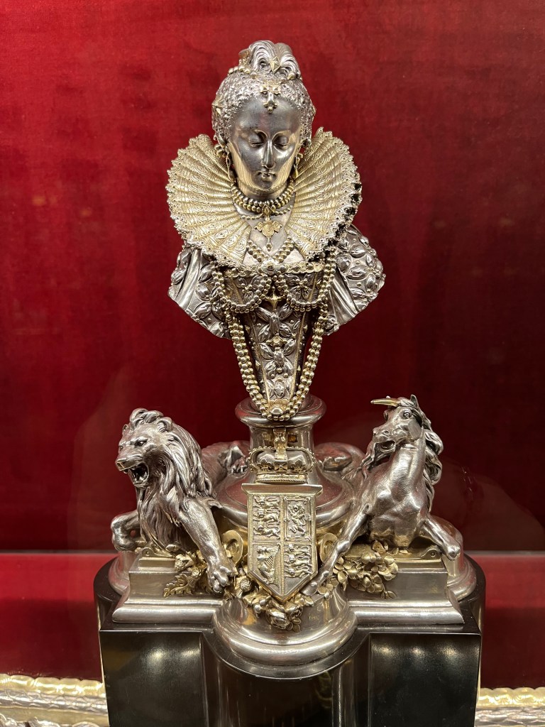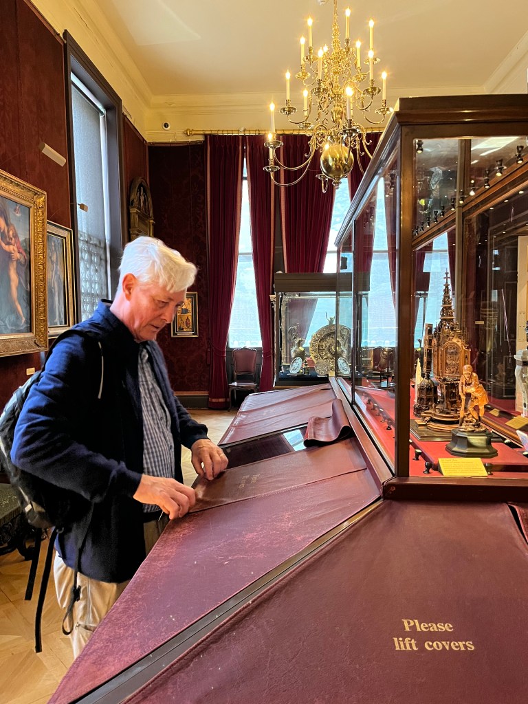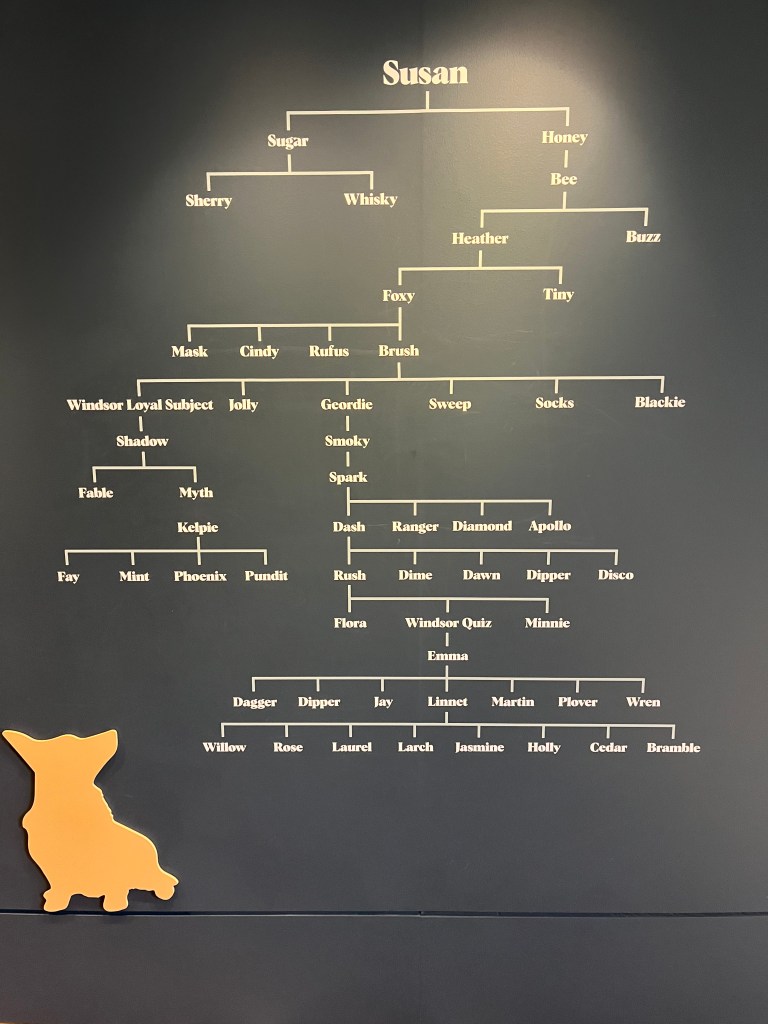 Not really giving him enough credit. The collection was remarkable. Beyond the usual artwork — portraits by Franz Hals, Rembrandt, etc. — a collection of hundreds of palm-sized hand-painted porcelain miniatures, in glass cases and under leather flaps you must lift (there to protect the watercolored and enameled miniatures from sunlight) stretch for about 100 feet down one side of the first floor. The other side is given to armor and weaponry … and a room of the recent queen’s corgis through the ages: see the photo of their lineage from the first she had, Susan, given to her by her father at age 18.