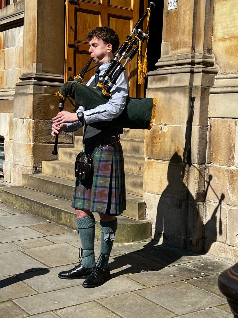 We wake and walk to the tube, where we must buy tickets — no tapping of credit cards as permitted in the London underground — and hie ourselves to the National Piping Center where a young man who looks just out of his teens, wearing a kilt and the whole megillah, plays tunes out on the street for 15 minutes before taking us inside and through the small but quite nicely done museum. He plays outside, he tells us, because … duh … his pipes would bust our ear drums if he played it inside under a low ceiling.