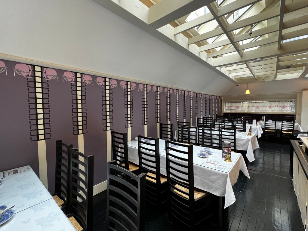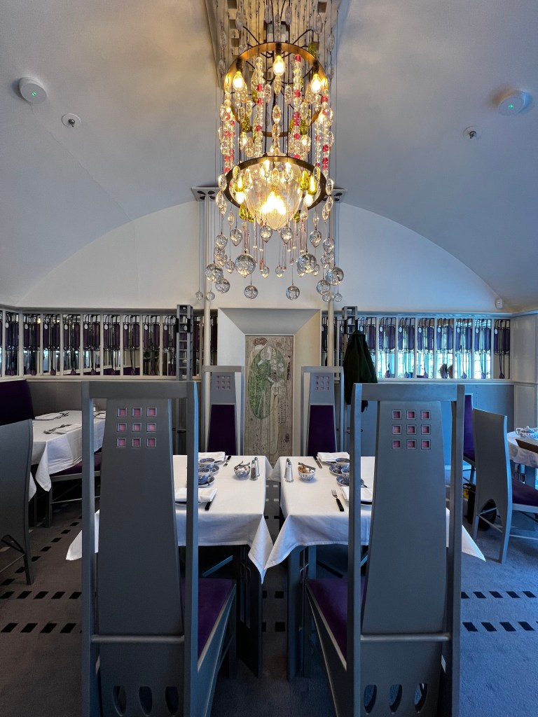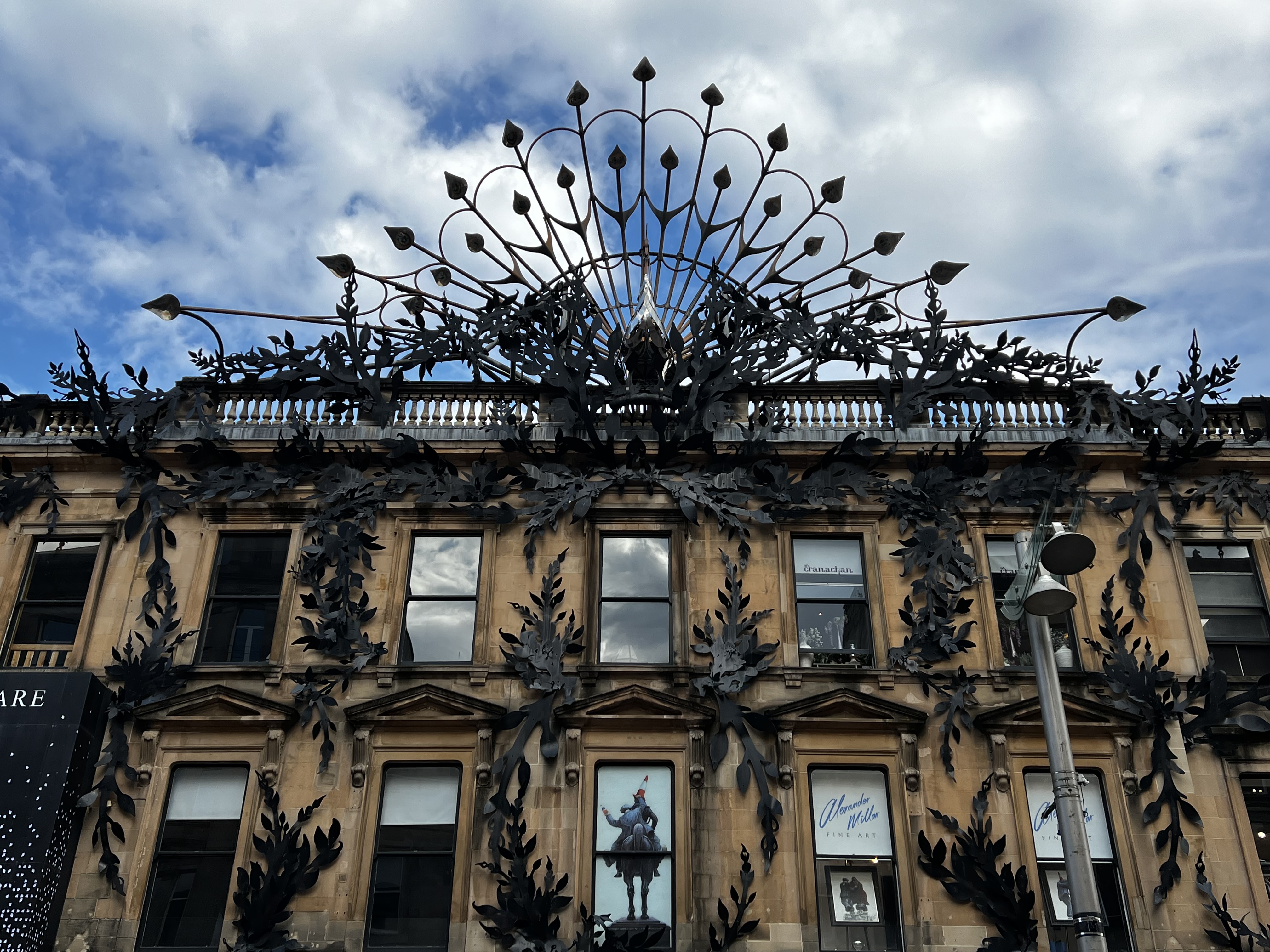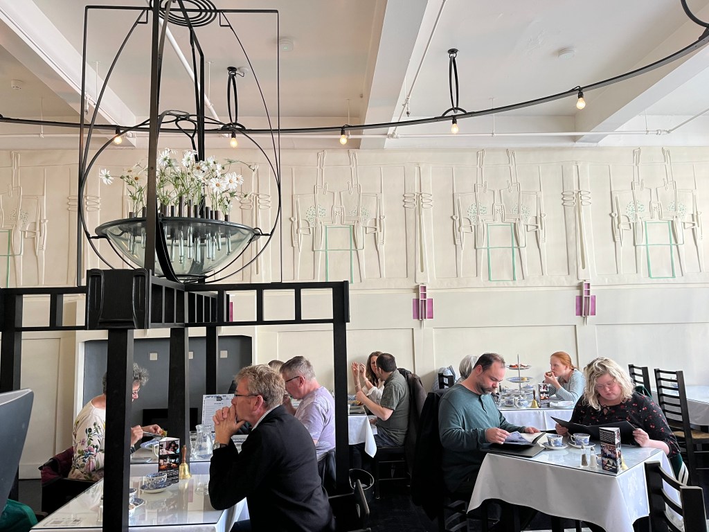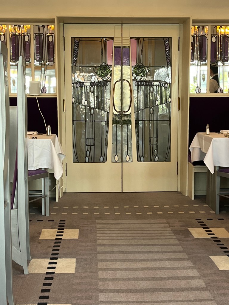 From the square, we meander downtown, past one of the first ticket houses for the Glasgow tube (tiny house with turrets), Princes Square shopping mall (the dizzying array of escalators) inside the art drecko exterior, and wind up to tour the Mackintosh Willow Tea Rooms, where we’ve scheduled ourselves for a high tea from 2 to 4. The Art Nouveau rooms Charles Ronnie Mackintosh (née McIntosh but he changed his surname because he thought it gave him that je ne sais quoi) designed for the establishment’s owner (and one of his devoted benefactors, Catherine Cranston) are truly unusual and stunning in their austere way. We partake in the Salon du Luxe, the joint’s crown jewel of a room, but, after the opening glass of champers, the food proves to be distinctly lackluster. That said, you can order about 30 different pots of tea. You don’t have to finish a pot before ordering another, and the wait staff will bring you as many as you want. And just being in the room for an extended time, so we can appreciate the many subtleties of its design, is a great memory.