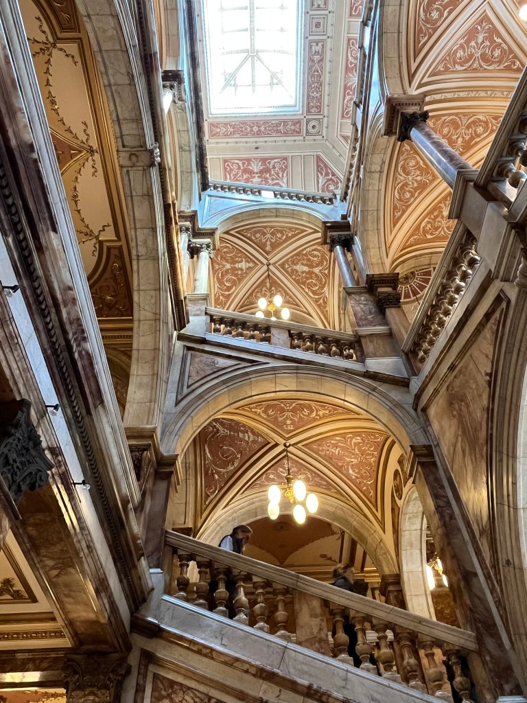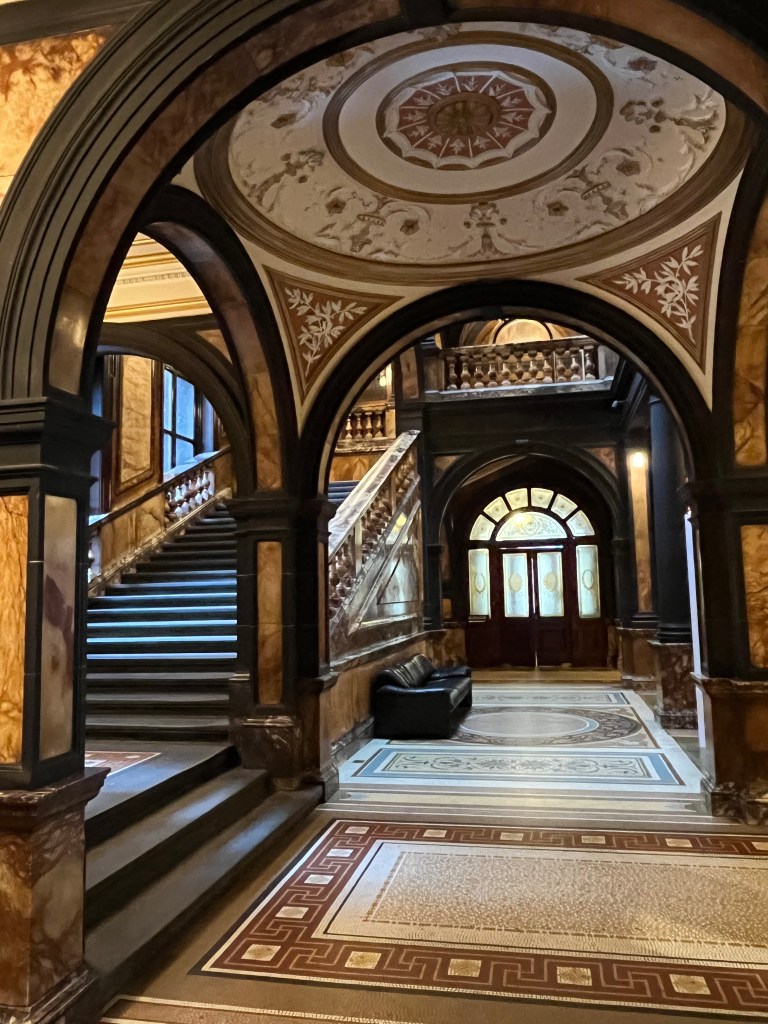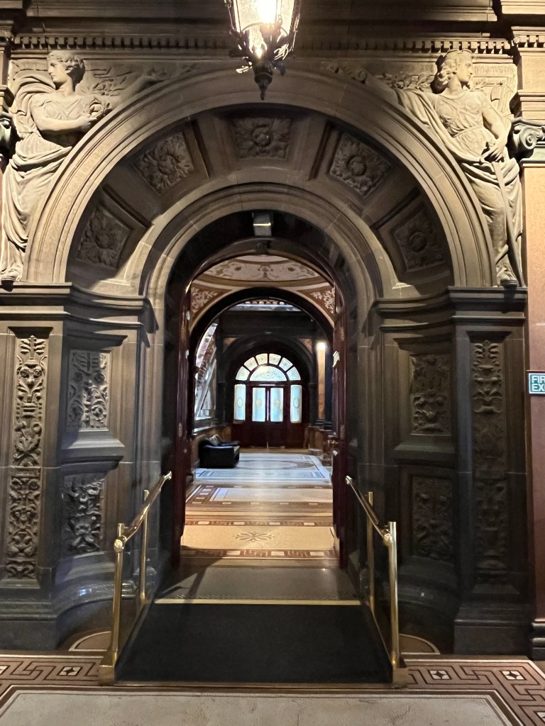 Afterwards, we walk to center city’s George Square, named for III but originally used to slaughter horses, where we walk about, gawking at the statues of Queen Victoria with a 19-inch waist riding a horse, Albert, and high above everyone else on an 80-foot column: Sir Walter Scott. We also duck into the large City Chambers on the east side of the square: impressive doors, impressive stonework, impressive staircases, impressive ceilings … in all, quite a grand place.