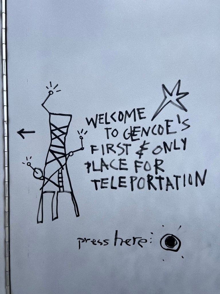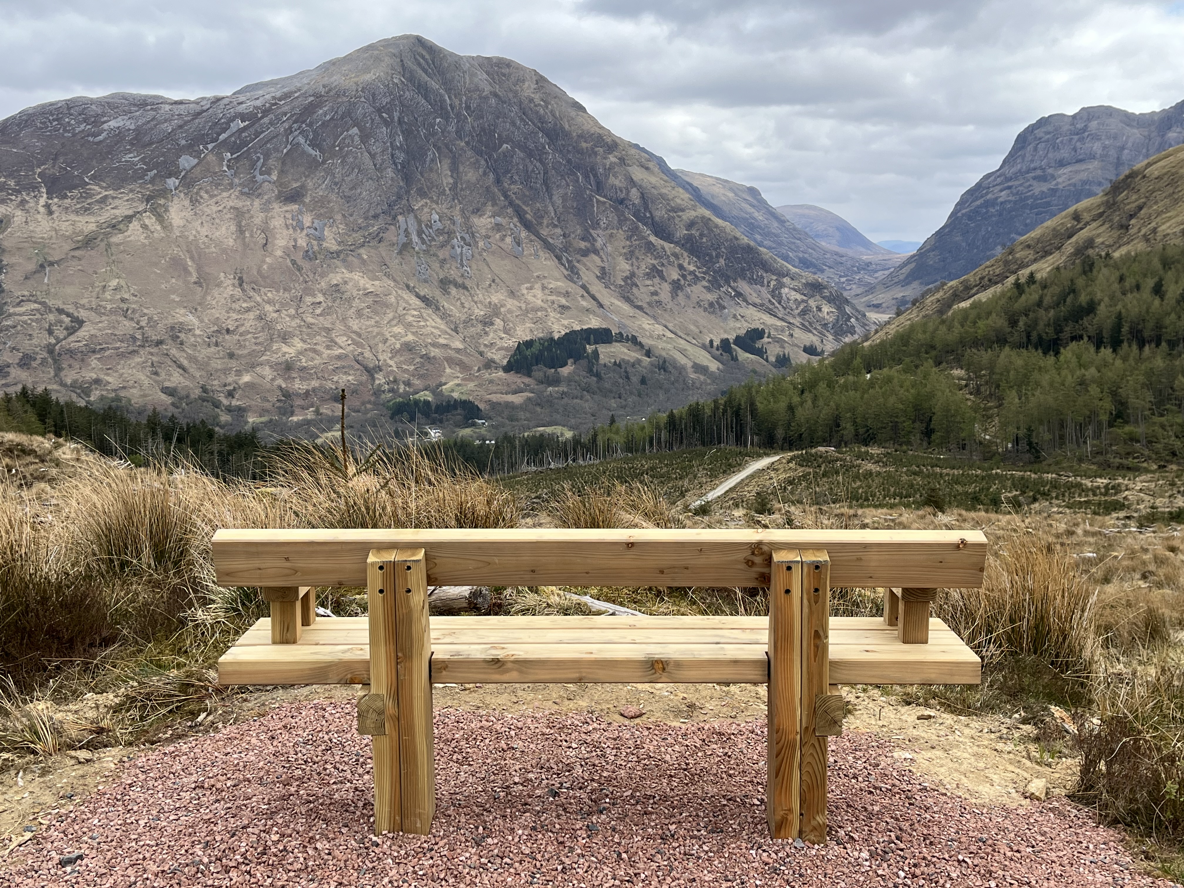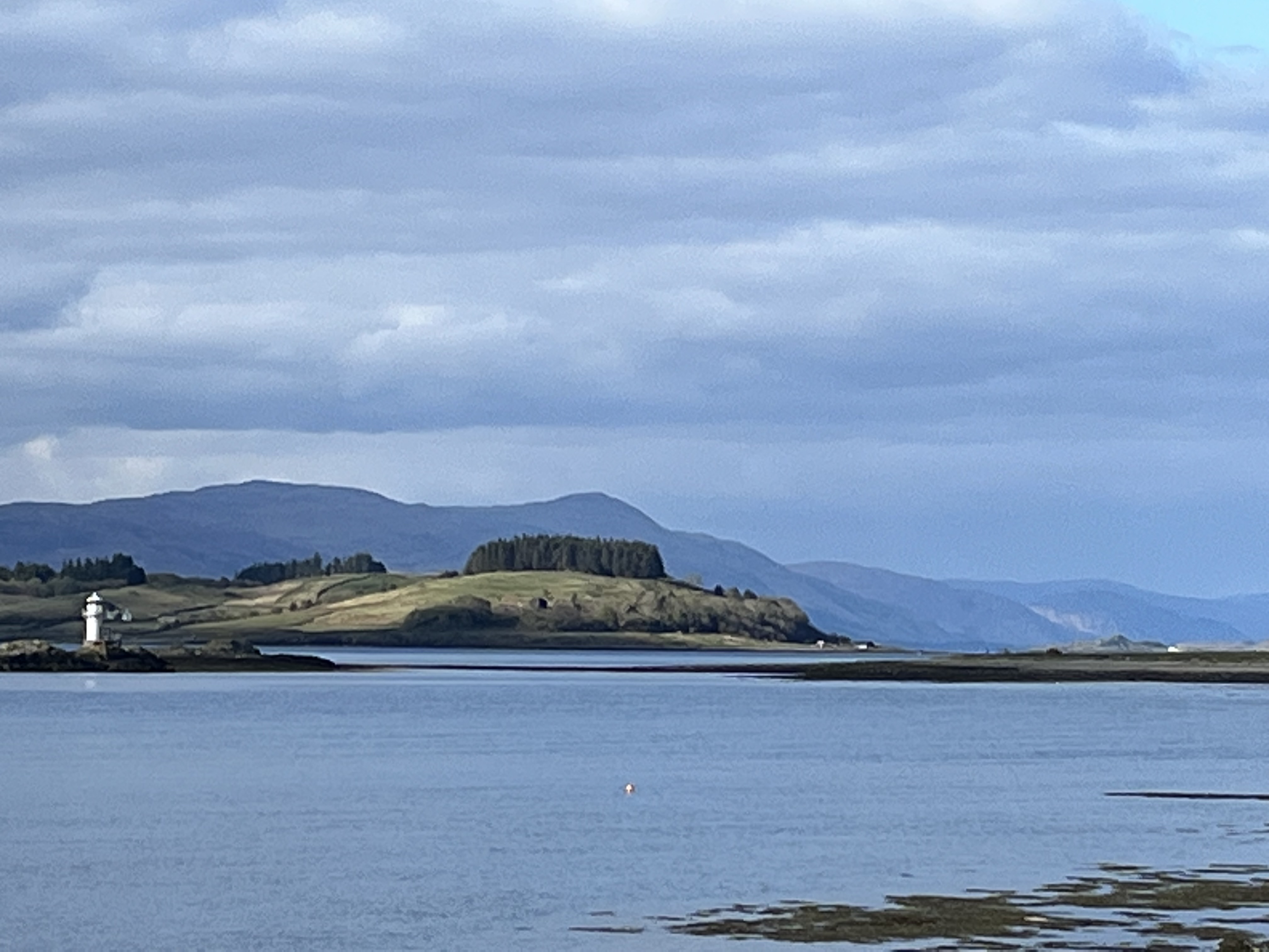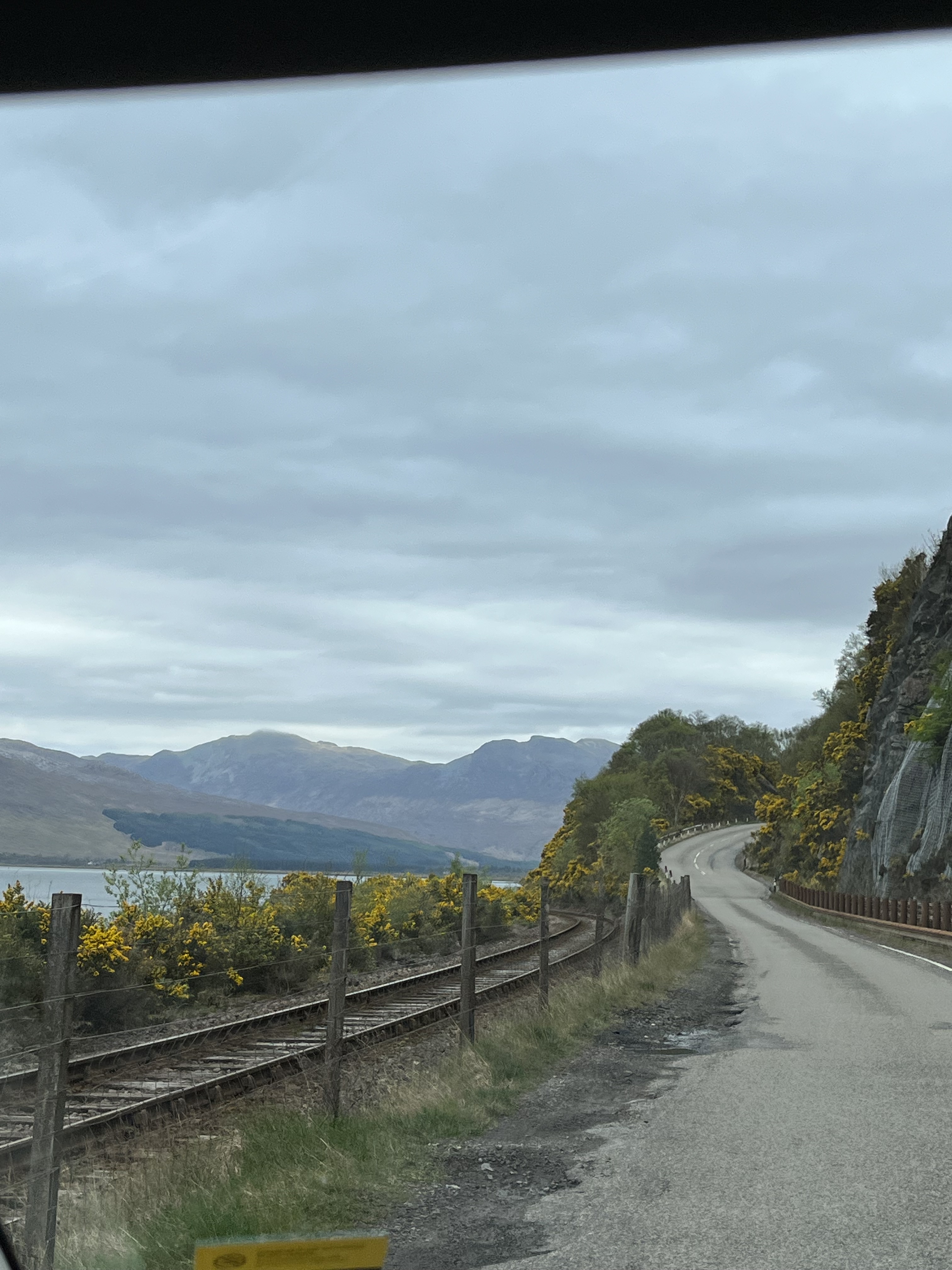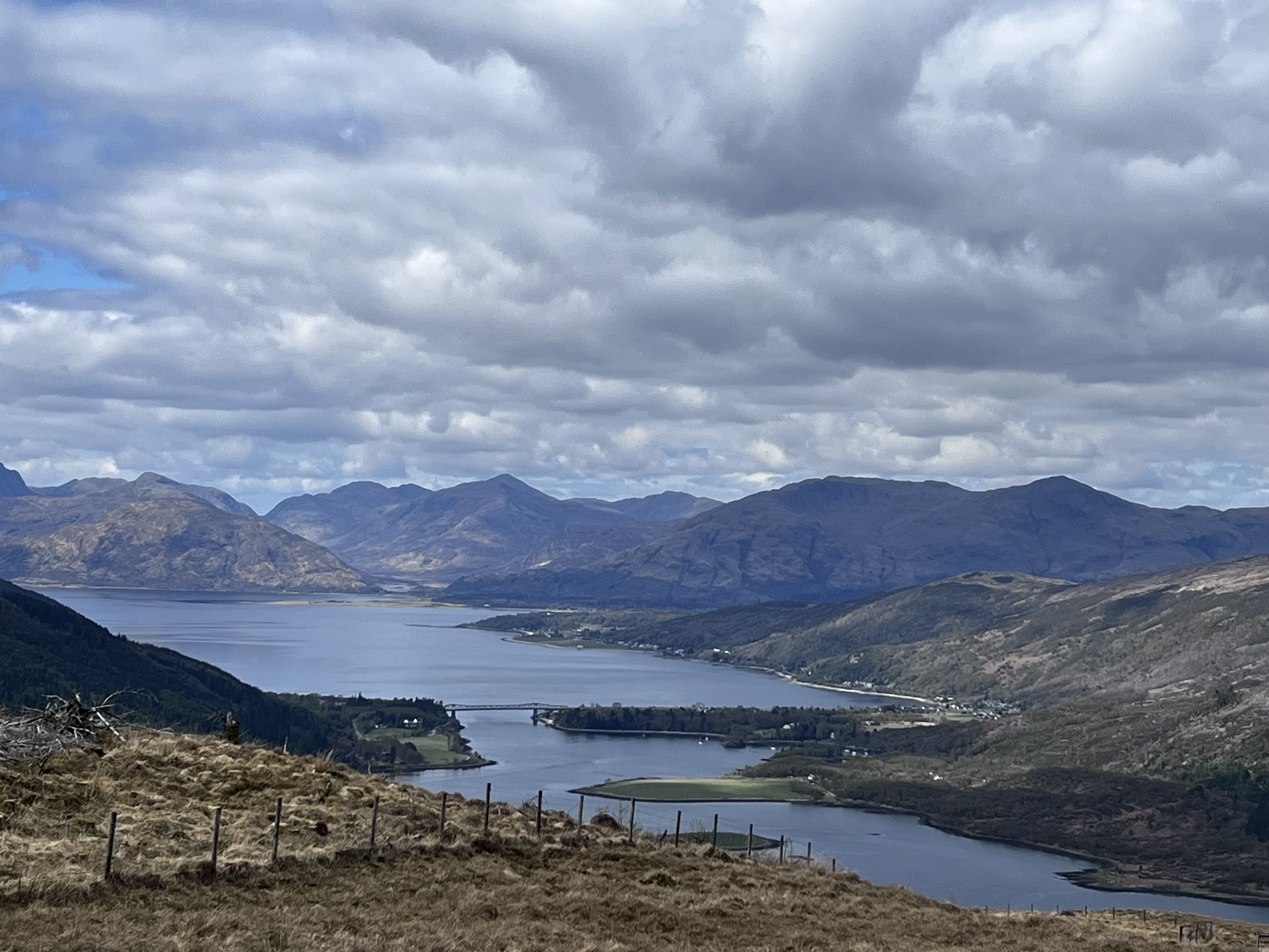 People with dogs climb the same path but few and far between. We have the world to ourselves. From the top, as you can see in the photo, you see the bridge of Ballachulish, two lochs and a panorama of pastoral gray clouds but unsullied by rain (ahem, for about the first time … but we’re not really complaining). Cynthia sits on a bench with a view of a valley with another completely unspeakable or pronounceable Scottish name while David climbs to the teleportation tower.