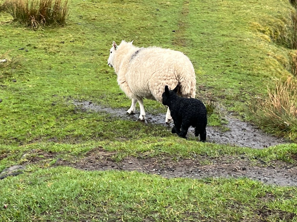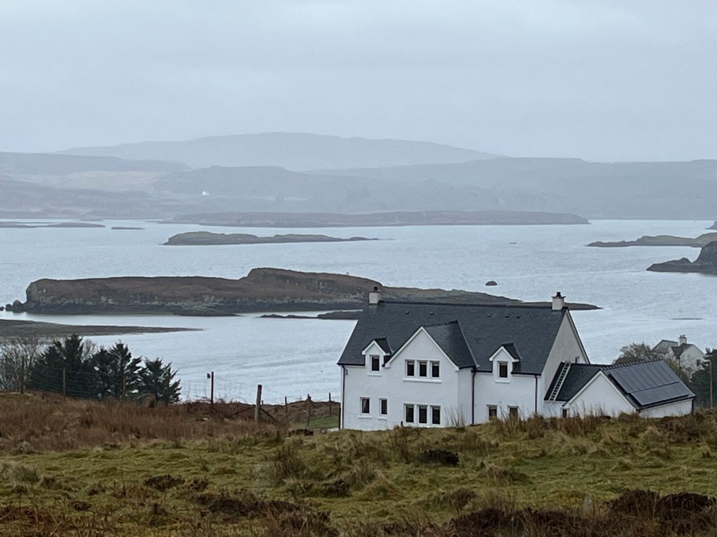 On one-lane switch-backed roads pitted with potholes disguised as puddles. We drop into most of them. We learn a whole new etiquette about “passing places:” basically crescent-shaped spots about half as wide as a small car where the ever-present roadside ditch (usually deep enough to swallow a car) has been filled, or where the roadside rock ledge has been gouged to form a niche. If you see a car coming toward you on the one-lane road, you have to determine which car is closest to the passing place on its side of the road. The car closest to its passing place is supposed to pull into it, letting the other vehicle pass. You should NEVER pull into a passing place on the opposite side of the road – in Scotland or England, the opposite is always, of course, the right side.