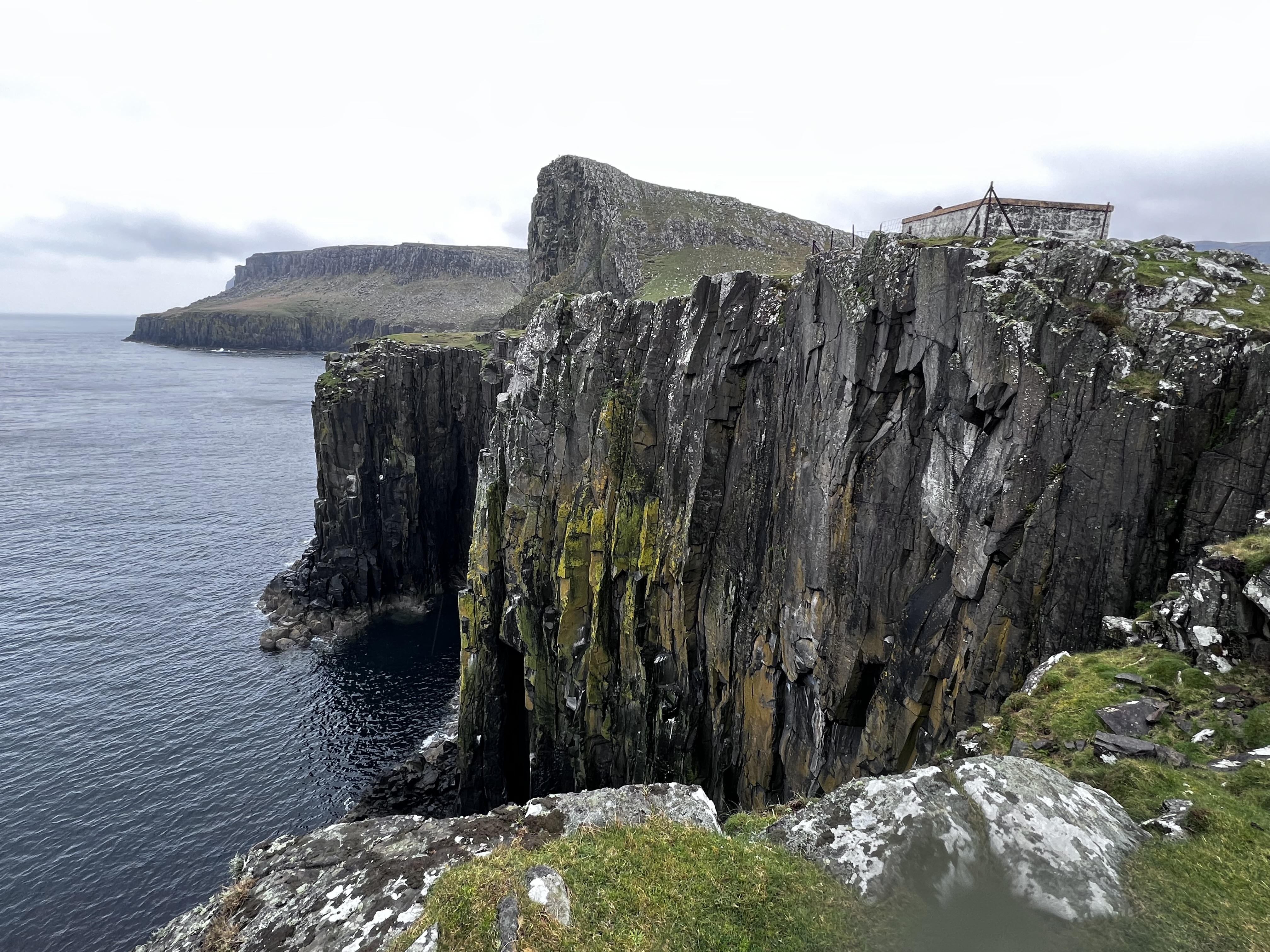 We drive to a small town named Staffin and ask a woman walking her two kids on the main road where we can find the bus stop that Cynthia needs. The woman says, “Anywhere. Just stand by the side of the road and wave it down. It’ll stop.” Cynthia wants to wait indoors so she gets the woman to direct us to a coffee shop that … lo and behold … has a bus stop directly in front of it. David drives away, heading to hike a promontory named Brother’s Point.
