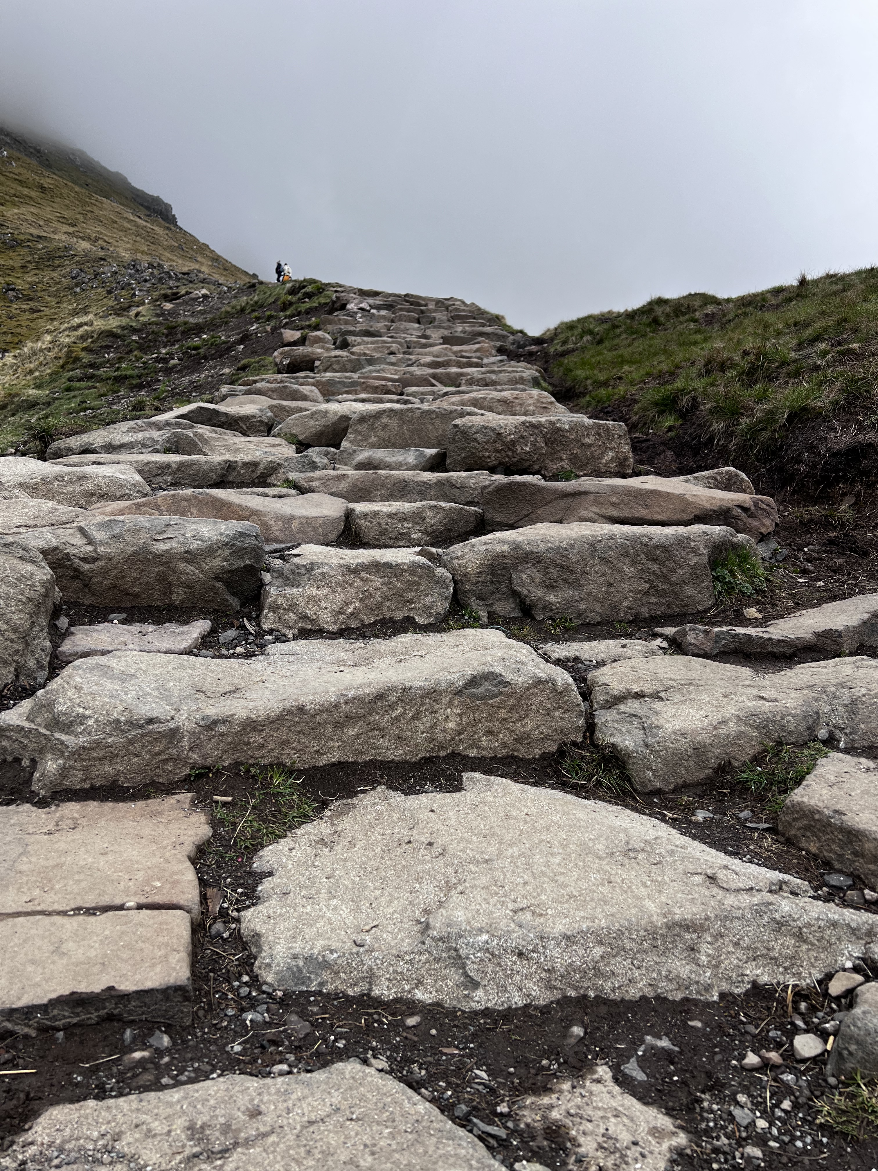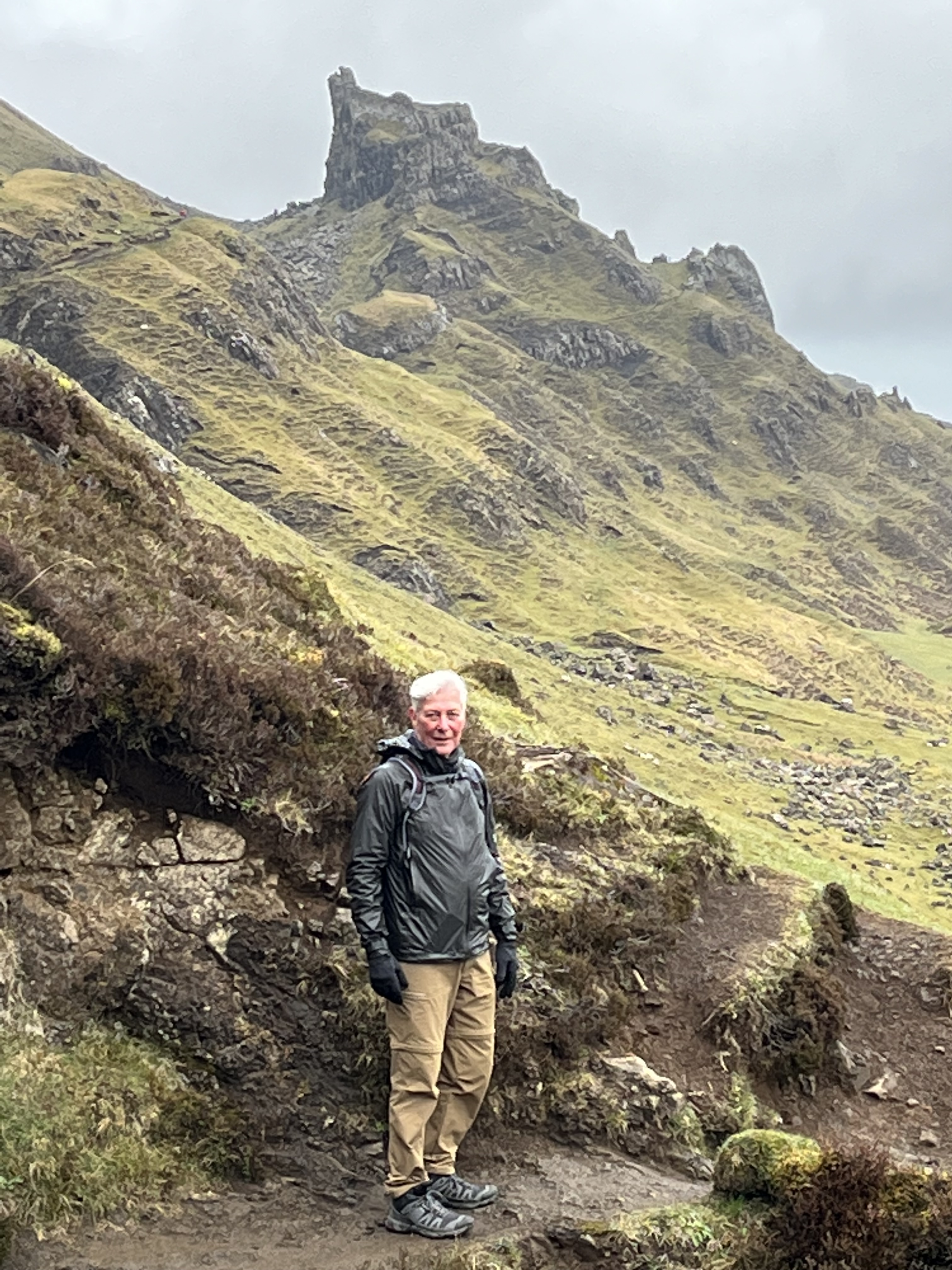 David’s hikes are nothing short of spectacular, partly because the weather gets both worse, and then clears, at both Brother’s Point and, later, at a place called The Old Man of Storr, part of the same Totternish Ridge that also forms Quiraing. On a clear day, Storr would just take away your breath. On a day with intermittent mists that dissipate suddenly in fleeting shafts of sunlight, it is magical, unreal. I won’t bother to try to describe it. It’s a seriously steep climb but worth it in every way. Don’t think; just do it. My pictures do not do it justice even remotely.