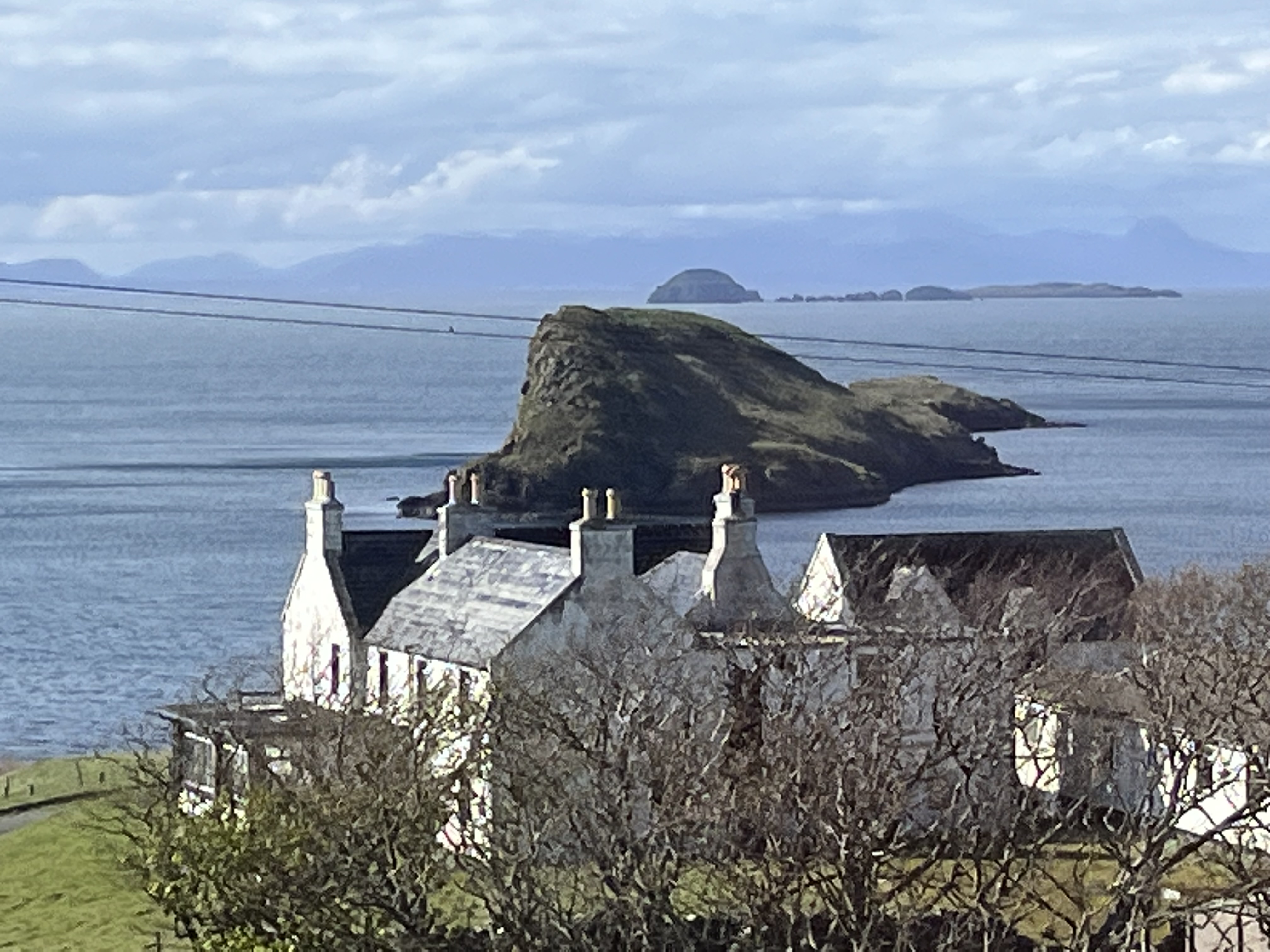 The museum is about halfway around the Trotternish peninsula from Portree so Cynthia was advised to catch whatever bus first arrived and then travel clockwise or counterclockwise to town. Waiting with me were two women who appeared at least my age but who were apparently traveling exclusively by public transportation and dressed for backpacker life. They were so impressively familiar in Skye. The bus stops were extremely busy with people of all ages. Despite the cold and rain there were many with backpacks the size of their torsos who were getting off and on at campsites. As we were told, the buses stop for anyone who flags them. In addition the drivers let you off at any spot you choose along the road. Name the hotel, campground, trailhead or museum and you will be left in front. The first bus to arrive is going clockwise. I board and move back to the middle.