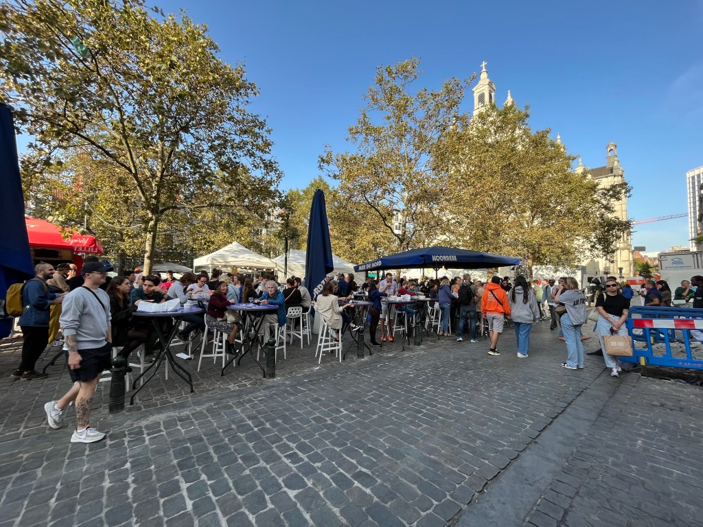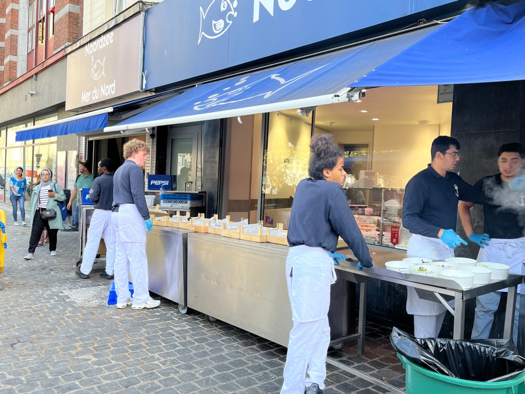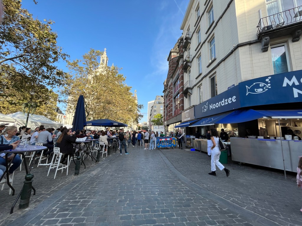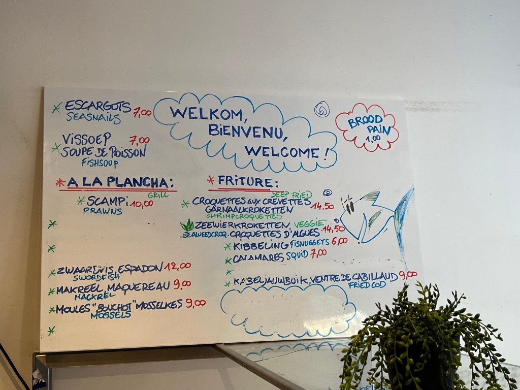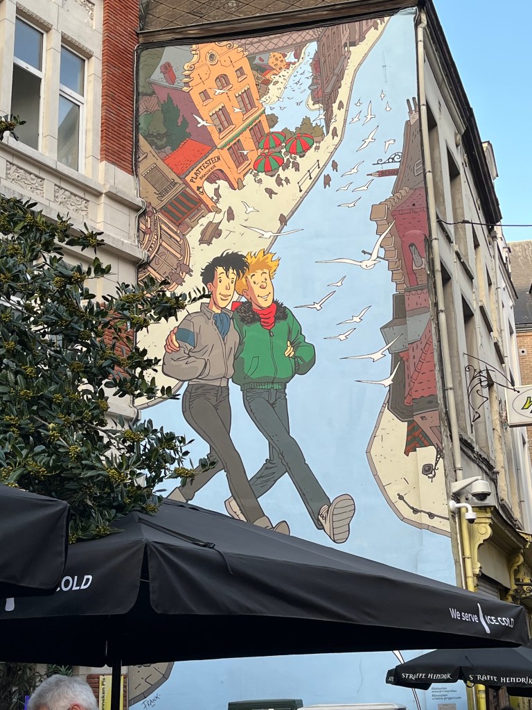 Our routine has become a light breakfast at home, some site-seeing and then largish lunch. More site-seeing in the afternoon and home by 8 with a light snack. So, after two house tours we were ready for lunch. Carolyn is always interested in mussels so we went to a Rick Steves suggested place called Mer du Nord/Nordzee. On Saturday afternoon it was hopping. One orders, pays and leaves a name. Then find a table and wait for a waiter to yell out your name and find you. We got 2 orders of mussels, some calamari and wine. No fries here !!! However, at the table next to us some men had fries that looked great. We asked about them and they gave us one to taste. Then took me to the little hole in the wall nearby. Perfect! (See the men with little boy behind Carolyn.)