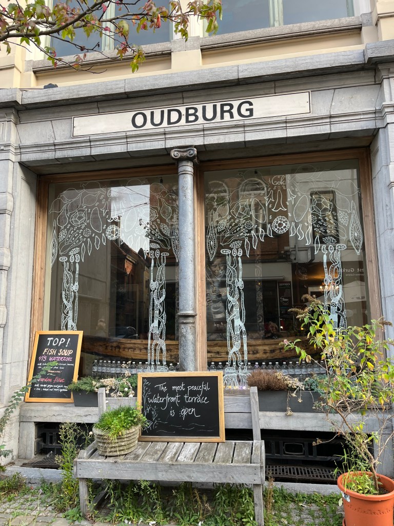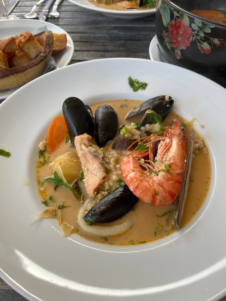 Carolyn did not see the alter piece. There was a line and it cost money. By the time I was out she was hungry so we went in search of food. A sign advertising fish soup – on the canal – sounded perfect. We walked through the building to the terrace in back and were happy that there were free tables. But once we sat down we learned why. Lunch was over and no dinner on Sunday. We expressed our disappointment and that all we wanted was 2 orders of soup. The waiter/owner went away and returned saying that the kitchen would make us soup. We were so fortunate. Carolyn declared it her best meal so far. We ate and tried to identify the ingredients: thai basil, coconut milk, lemon leaves, shellfish broth, shrimp, mussels, salmon, rice. Wonderful.