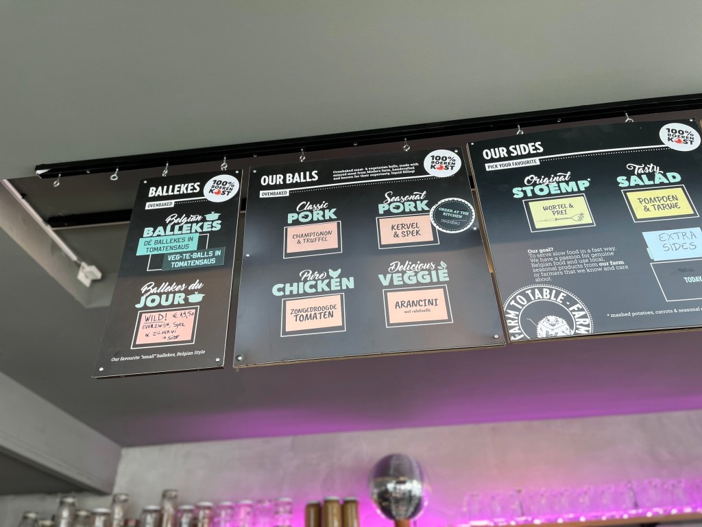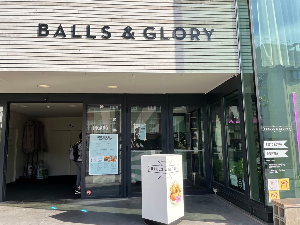 The Rick Steves walk started at the station and led into town. The initial blocks were pedestrian shopping areas. We were getting hungry and had two ideas. One was the Horta Cafe – a restaurant in a Horta designed building. The other was Balls of Glory, a recommended chain serving meatballs that are like tennis balls filled with sauce. Although of a totally different class of dining experiences the two were only a block apart. Horta came first and we immediately wanted to eat there. We shared a mussel soup and Niçoise salad and both were delicious. After lunch we walked further and bought take out meatballs to have for dinner back in Brussels.