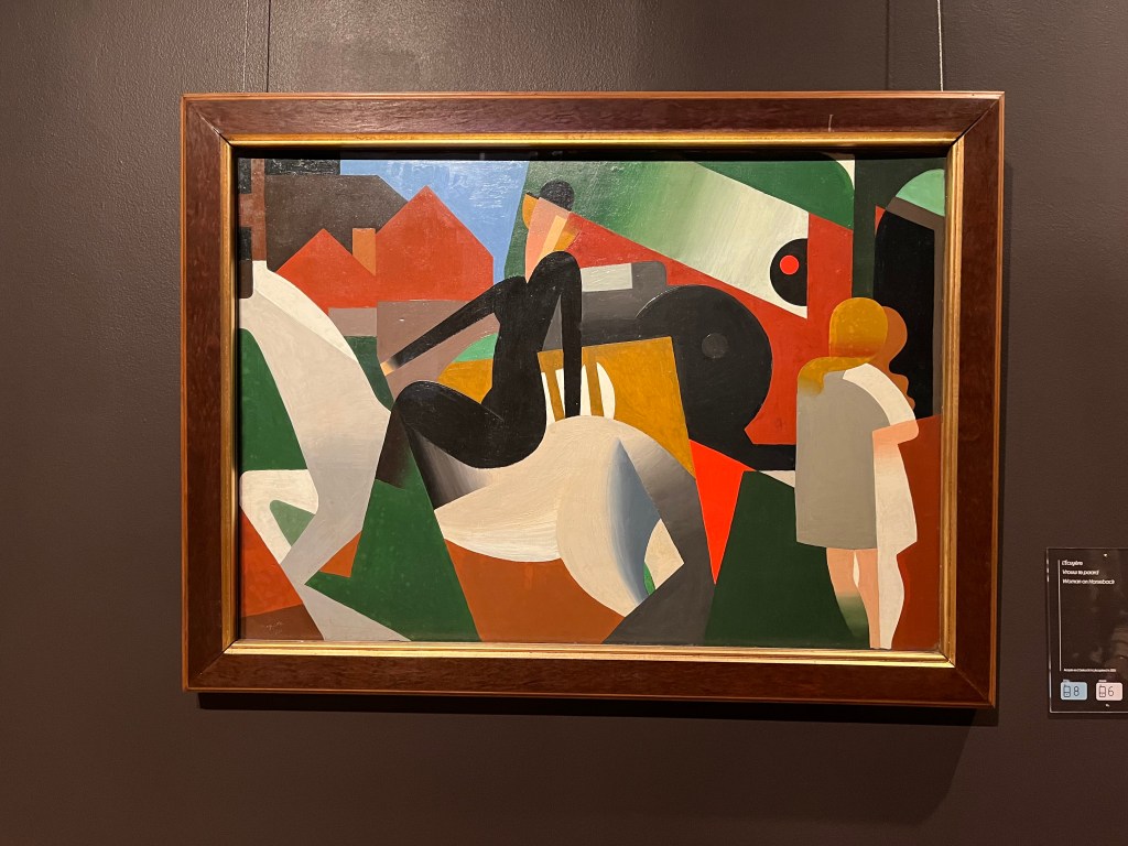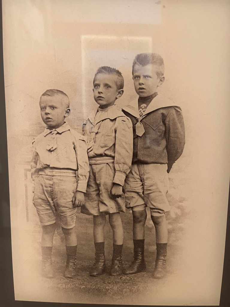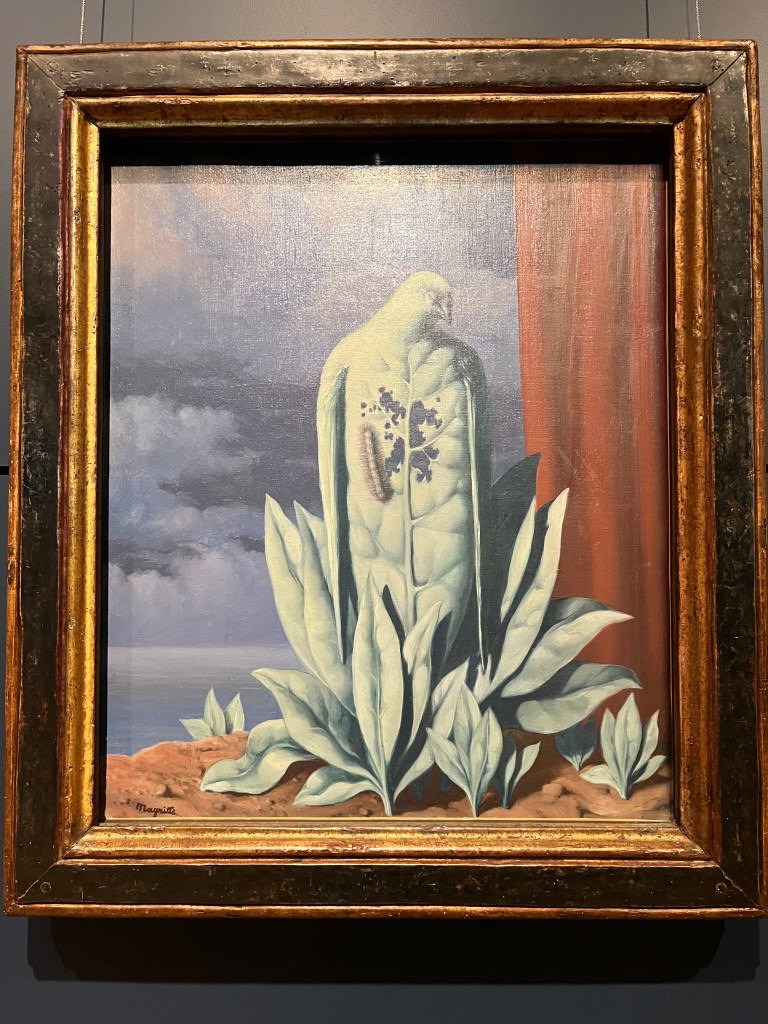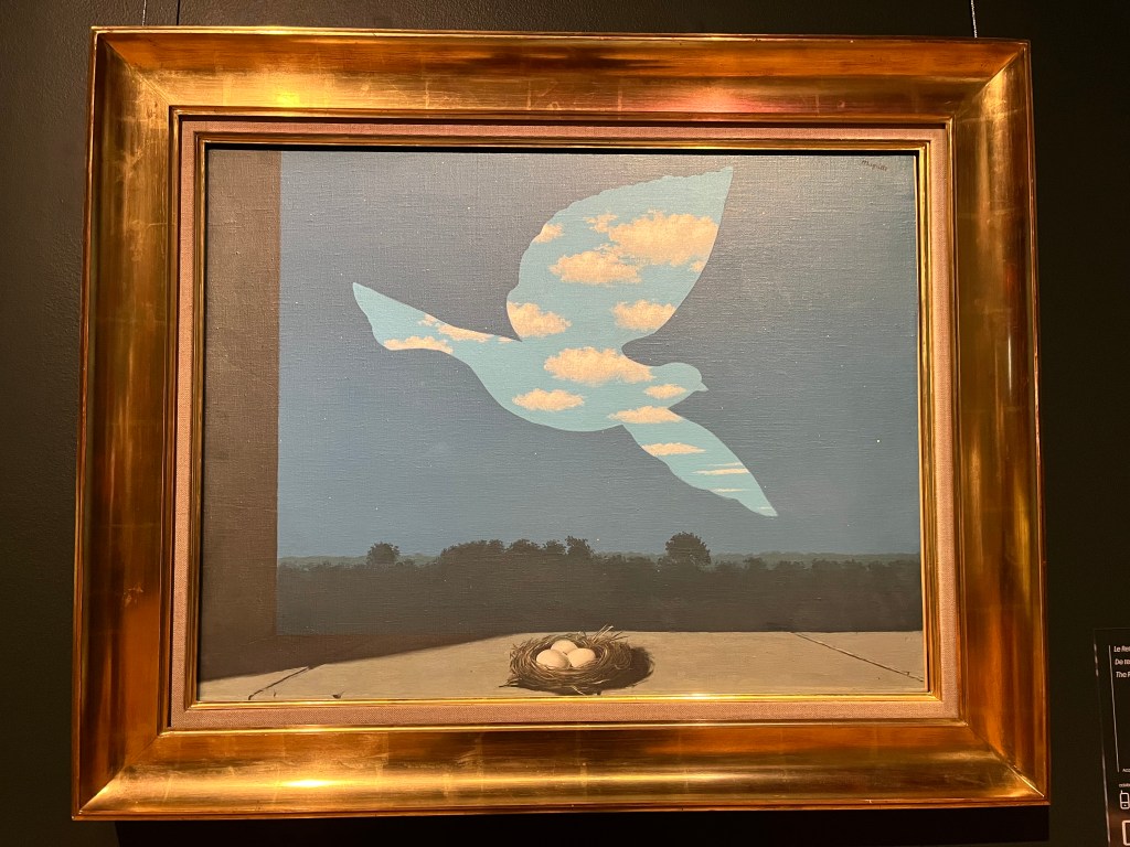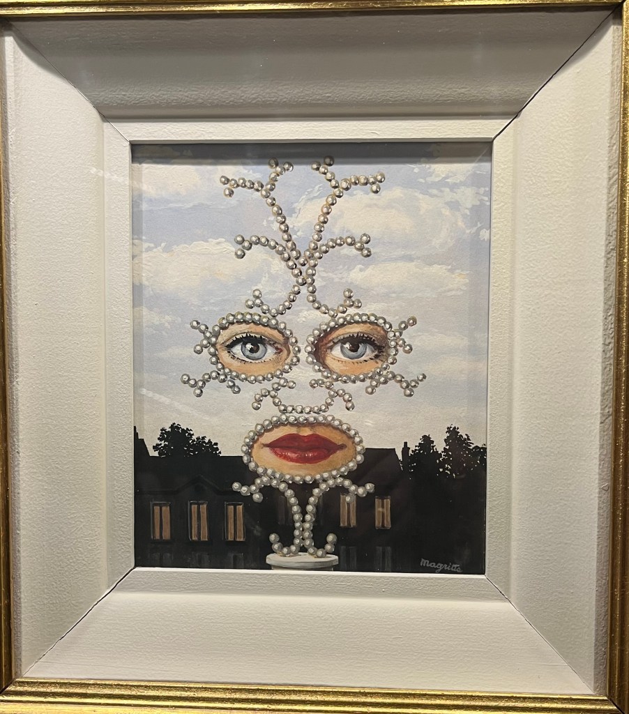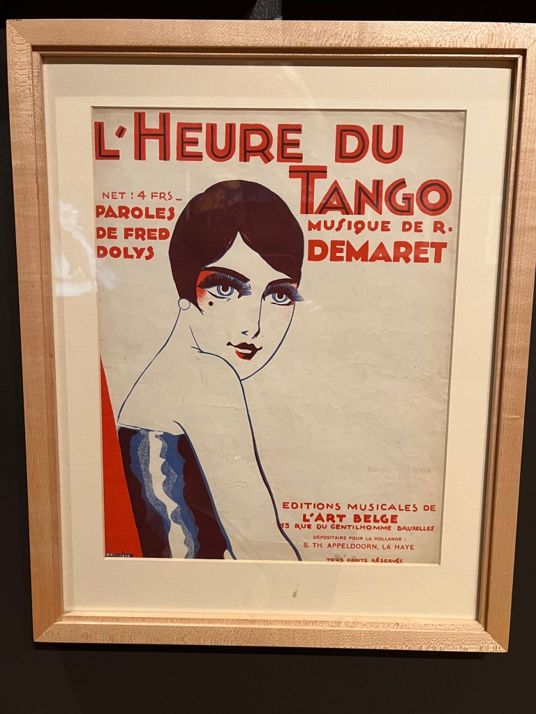 Top of my list for our last day in Brussels was a tour of the Magritte Museum. It had been closed and reopened just a few days ago. I expected to see a lot of Magritte paintings and was surprised that much of the exhibition was about his family and friends. Starting with childhood photos and his mother’s suicide. Then his association with different artist groups who were his best friends and then rejected his changes in style. He had several distinct artistic periods and early on produced advertising posters and covers for music scores in order to survive.