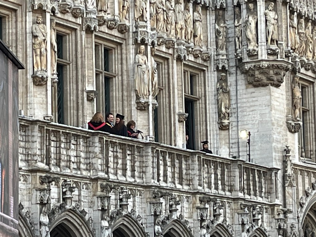 Our last destination before home (and packing) was the Tintin shop where I planned to get a tee shirt for Byron. Unfortunately they did not have his size. But the shop is near an excellent chocolate shop and we bought some more. To get to the Central metro station we walked once last time through the Grand Place and came upon a graduation ceremony taking place at the town hall.