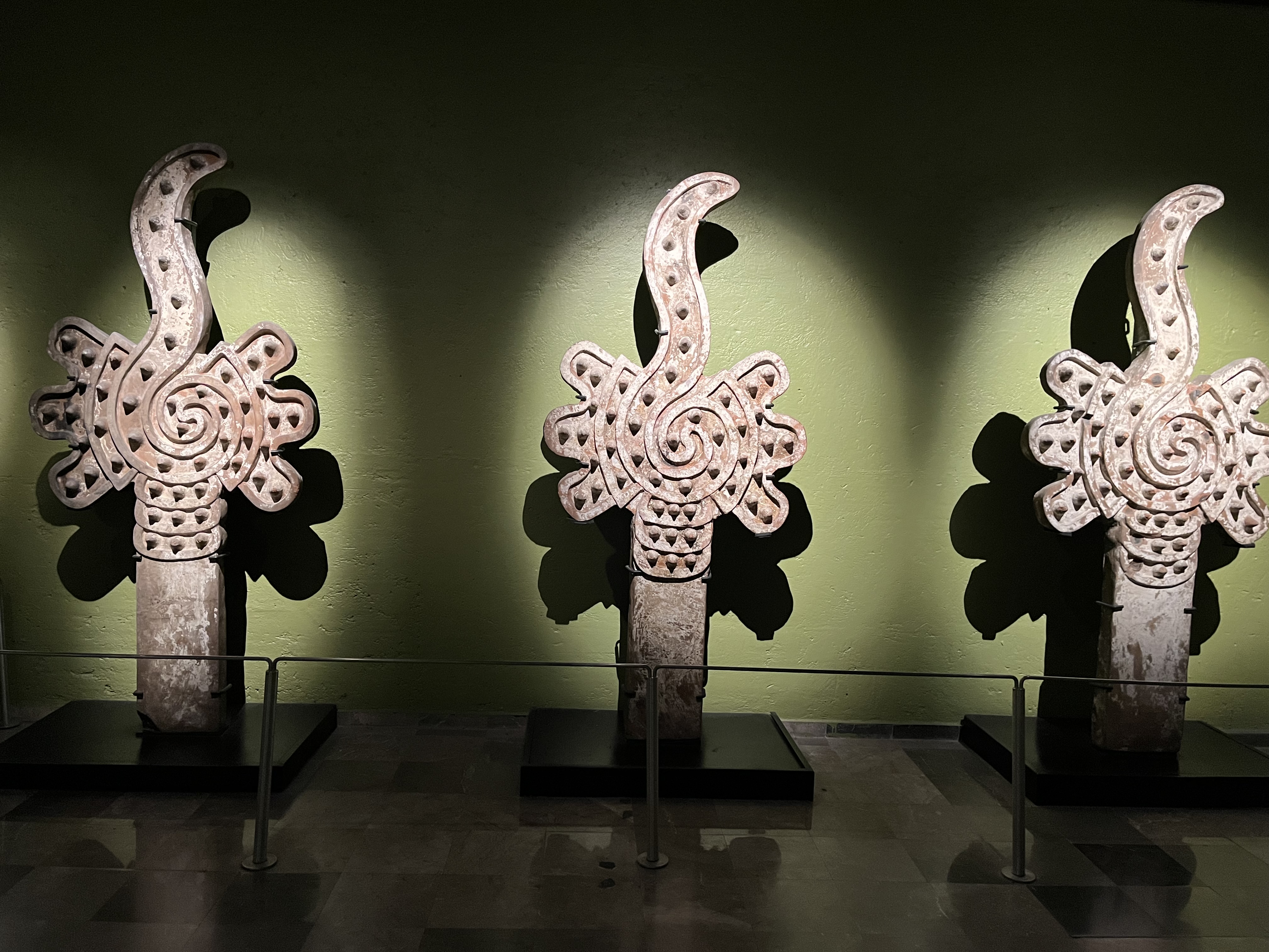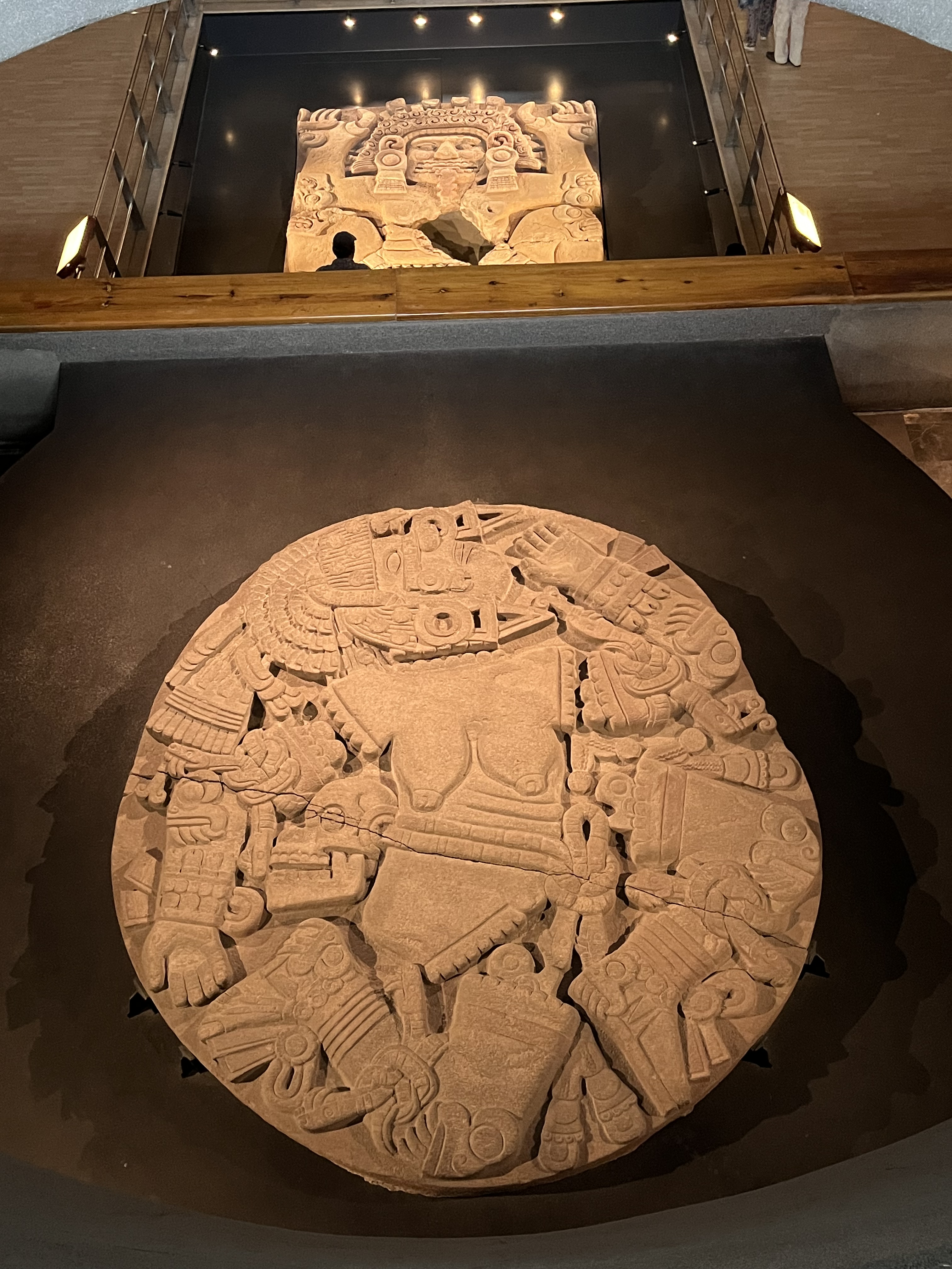 The first exhibit you see inside the museum is a wall of 120 dead heads. The next jaw dropper for me was a life-size terra cotta statue of a skeleton with its liver hanging down from inside its stomach. Apparently the Aztecs believed the liver was the center of a body’s life force. Ceramic pots with the face of Tlaloc, the water god, models of Chinampas agriculture — floating islands of mud built on stilts driven into the swampy basin of lakes that used to be Mexico City and environs — in all, almost as full of artifacts and information as the vaunted but we will see it tomorrow anthropological museum.