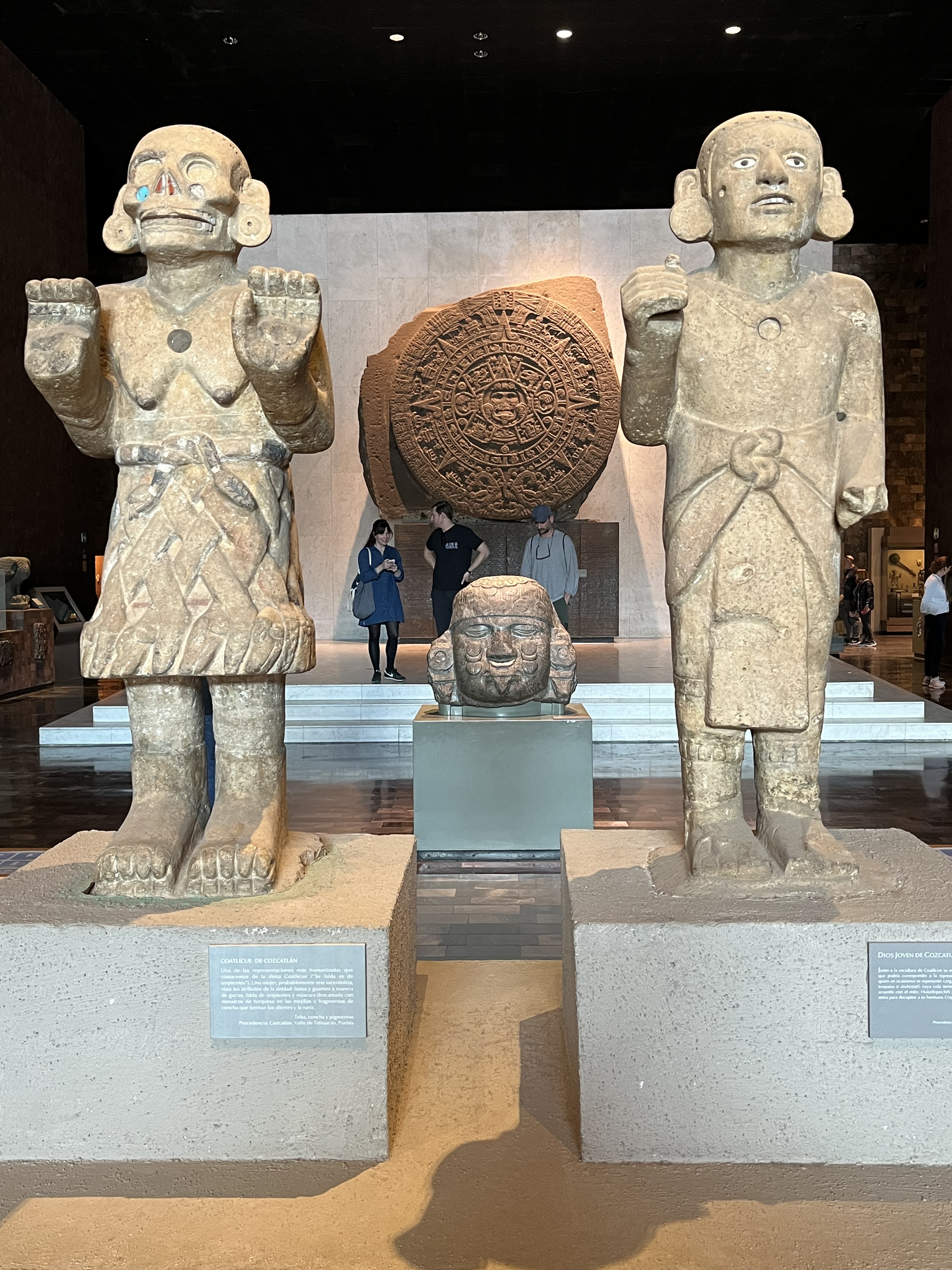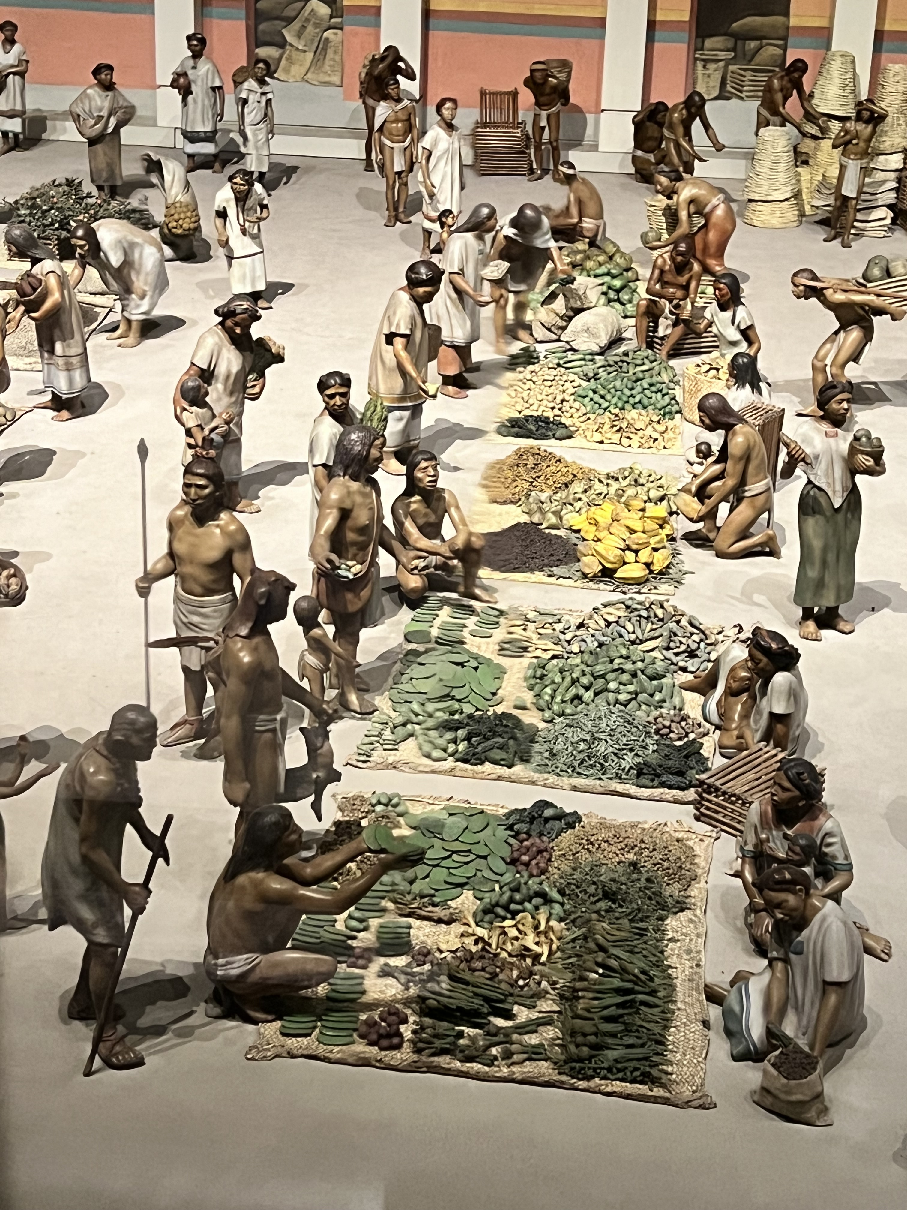 The first artifact we’re directed to by the Q-coded phone app for the museum in the pre-pre-pre-history room is the skeleton of a mastodon lying on the ground under glass. Tusks so large I would not be able to stretch my hands around them and touch fingers. Of course, source of food, clothing, tools, and art materials for the natives. We move on to a variety of sculptures of gods for water and fire and maize and the sun: intricate, delicate in a pre-colombian way. Behind the “Sun Stone” — a stone wheel about 20 feet in diameter praising what makes life grow — there’s a recreation of a Teotihuacan market with hundreds of people, all about four inches high: sitting in front of their market wares and walking around to find the best deal, just like the Mexican open-air markets we subsequently will visit. Le plus ca change ….