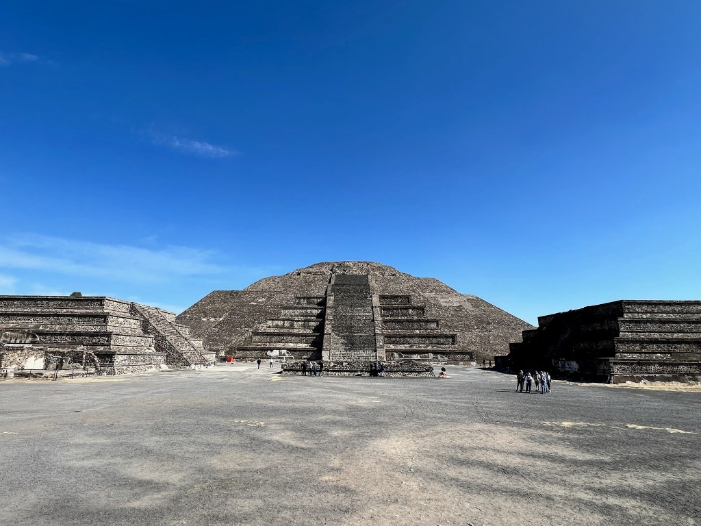 All that said, I stood in the middle of the site, in front of the largest structure, the Pyramid of the Sun — and looked left to the Pyramid of the Moon 20 football fields down a main road lined on both sides with reconstructed walls and buildings — and looked right about 50 football fields to the ruined ball court and other structures — and I have never felt smaller and more insignificant, more impermanent or, in the short fold of time I have been alive, more meaningless as an individual or American or human being. This place is just so vast in size and exposed to the elements, the main pyramids so large and solid and ponderously heavy … I was humbled.