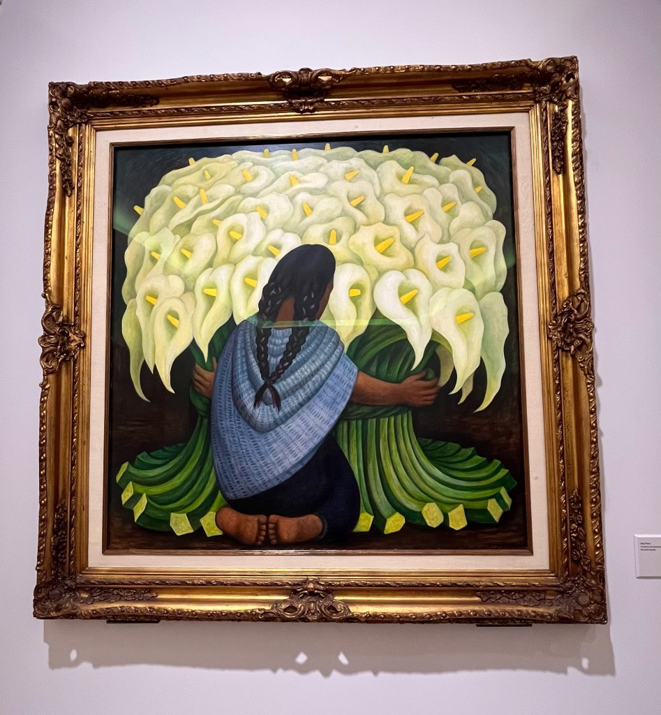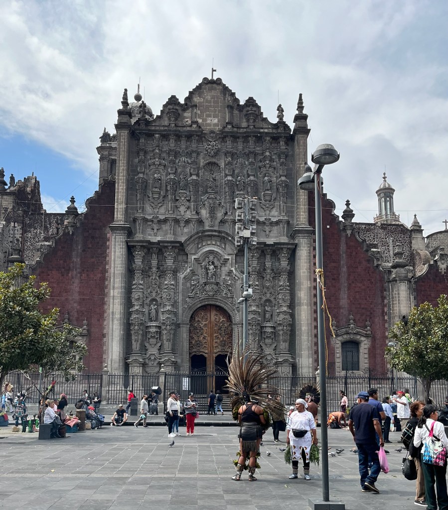In the meantime, Debra and Cynthia had a lovely brunch at the original El Cardenal restaurant in the historic area. It is very popular with a 20-30 minute line out front. The weather is nice, so the wait is easy. Seated, a server comes to our table with a platter of fresh baked pastries. We each choose one to enjoy while we order and wait for our mains. After brunch we head to the Zocolo and the cathedral. On our way we see a tourist info stand and ask about the Secretary of Education building and the National Palace building. The woman speaks with forked tongue, telling us the Education building is open now and that we might get into the Palace. A political demonstration was planned for today — so the National Palace was closed — but, she says, the demonstration was cancelled, so it might be possible to get in this afternoon. We call David.