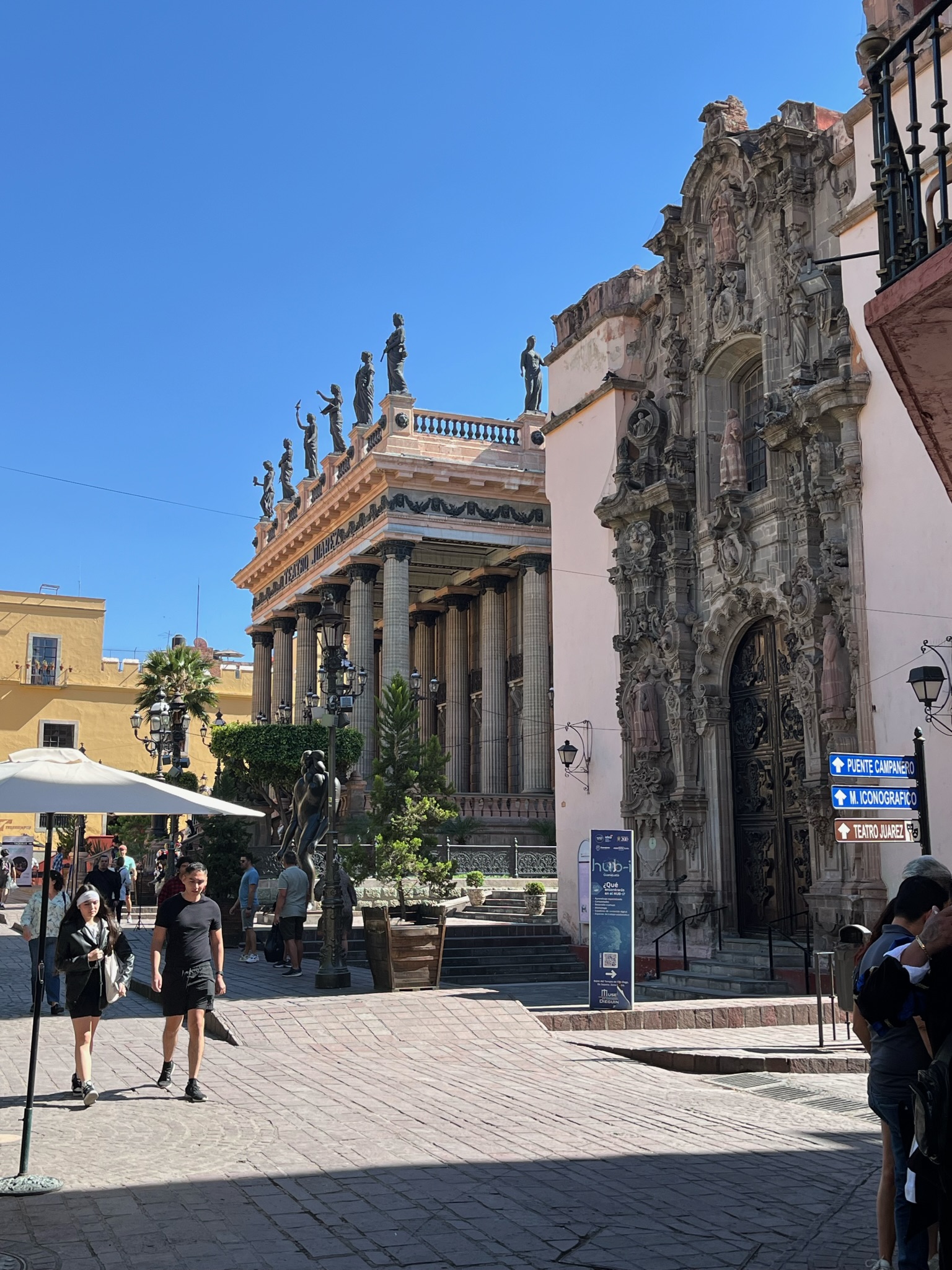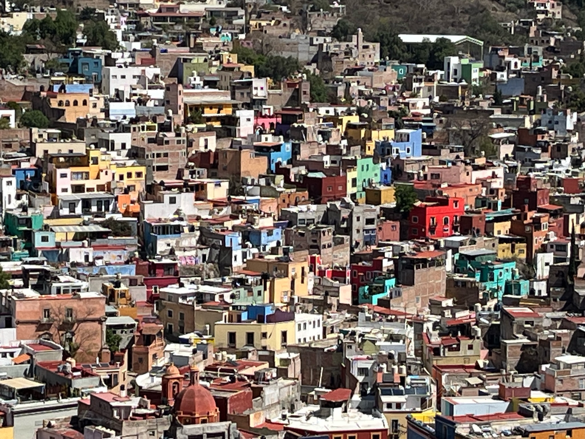 French-press cafe, eggs and bacon served early at our casa by yours truly fuel the early morning ride we booked with Jorge, our guide for the day, to the one-hour-away silver-mining mecca of Guanajuato, a much larger city with a more European vibe than SMA: bigger buildings in centro, wider streets, a huge theater with separate lounge areas for men and women. The women’s lounge in an open area on the second floor has three vast pink sofas that are separated from the cigar-tinged-dark-inlaid-wood-brandy-beneath-august-portraits-only-serious-business-here-mens-lounge by a firmly entrenched wall of glass doors. Inquiring minds wonder who wanted to keep whom from the flow of gossip.