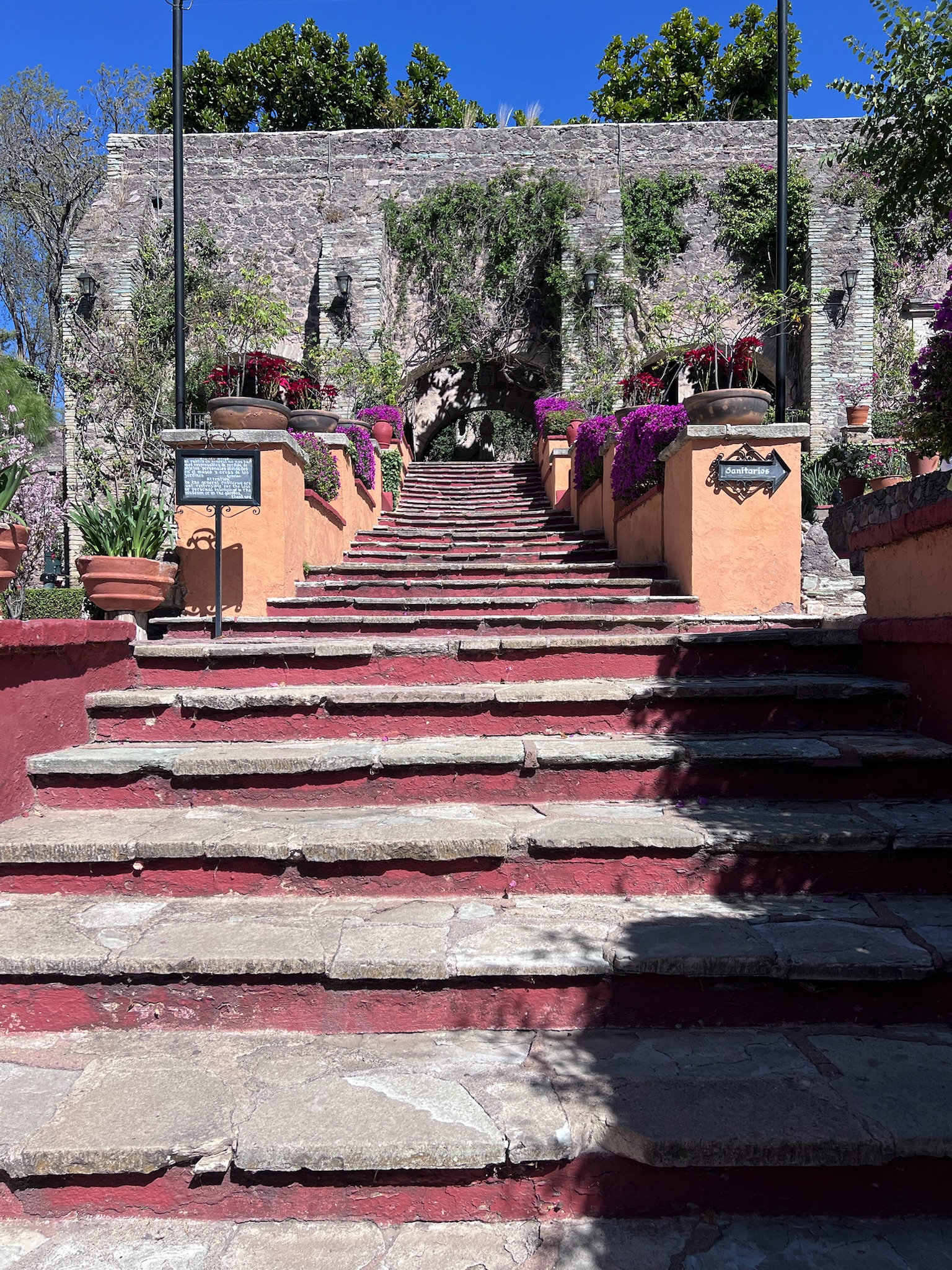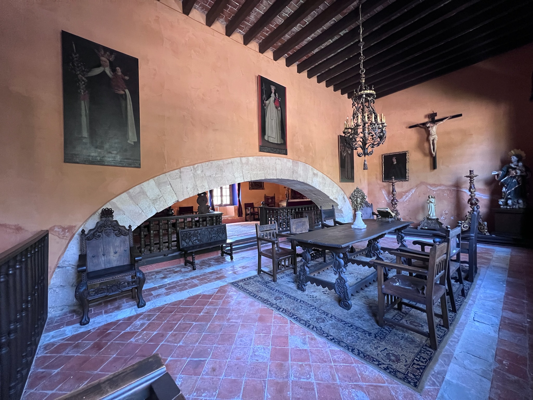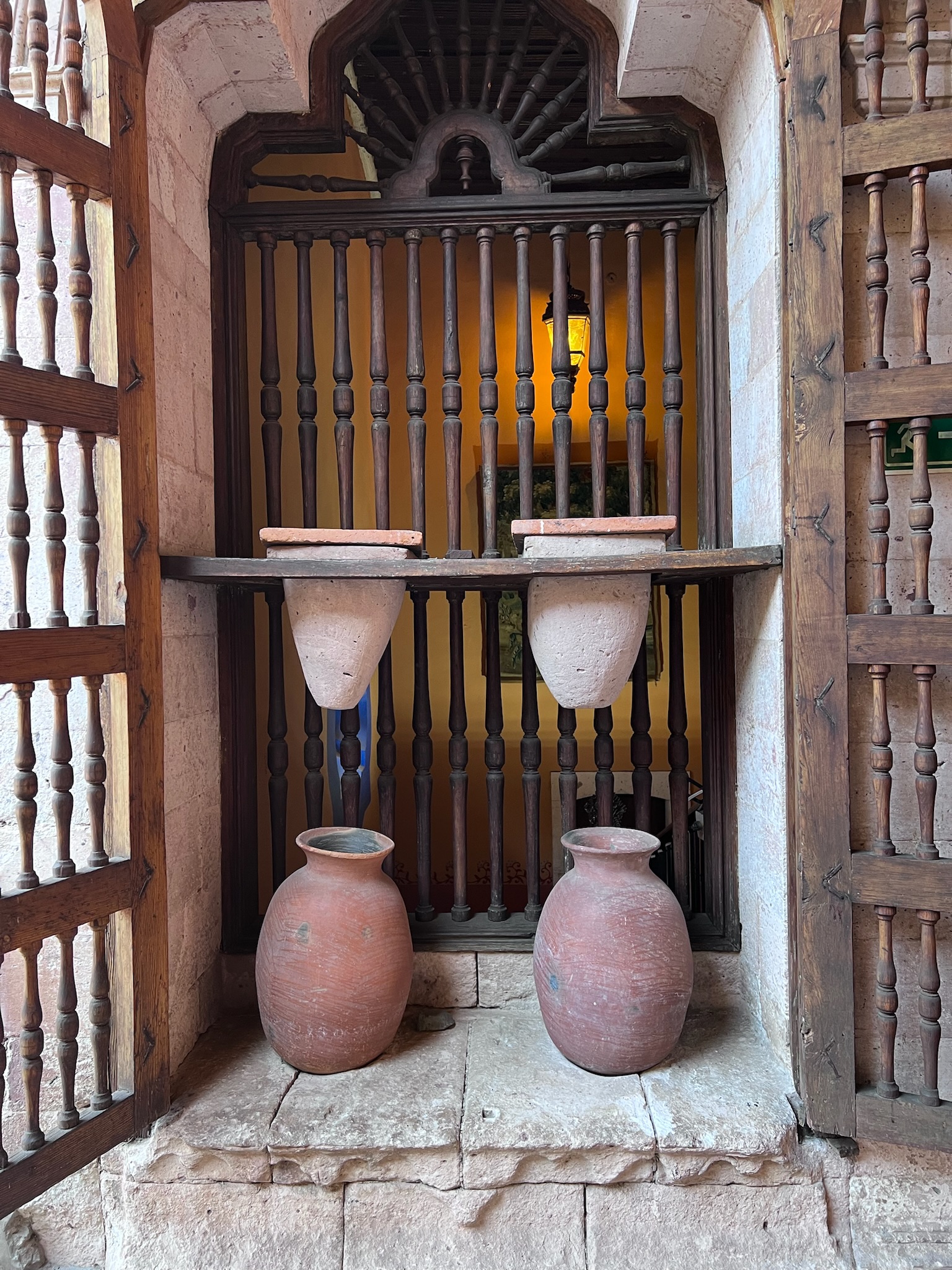 Jorge leads us to the hacienda caretaker’s room and shows us a portrait of a stern-faced woman who looks vaguely like Judith Anderson playing Ms. Danvers in Rebecca. This gal was basically a plant by the local Catholic church to ensure that appropriate portions of de la Berrera’s loot found its way to God’s earthly emissaries, and that all family members were married to “the right sort.” And he points out the four-urn water purification system on the second floor (pour water into the sandstone jugs on top, cover them to keep out insects and dust, let the water drip through into water-tight ceramic bowls below). It’s all grand: 17 different gardens, a pool, several buildings, private chapel … as you might imagine, the place now hosts a lot of weddings.
