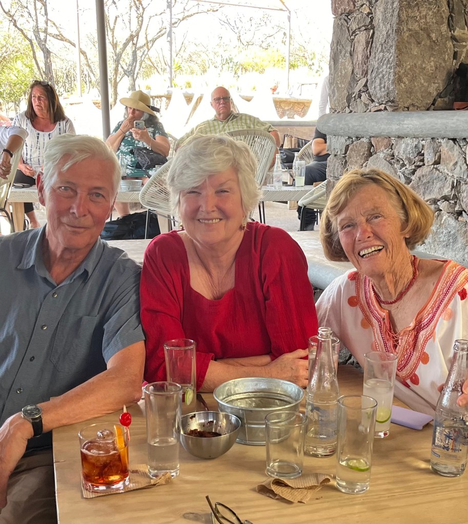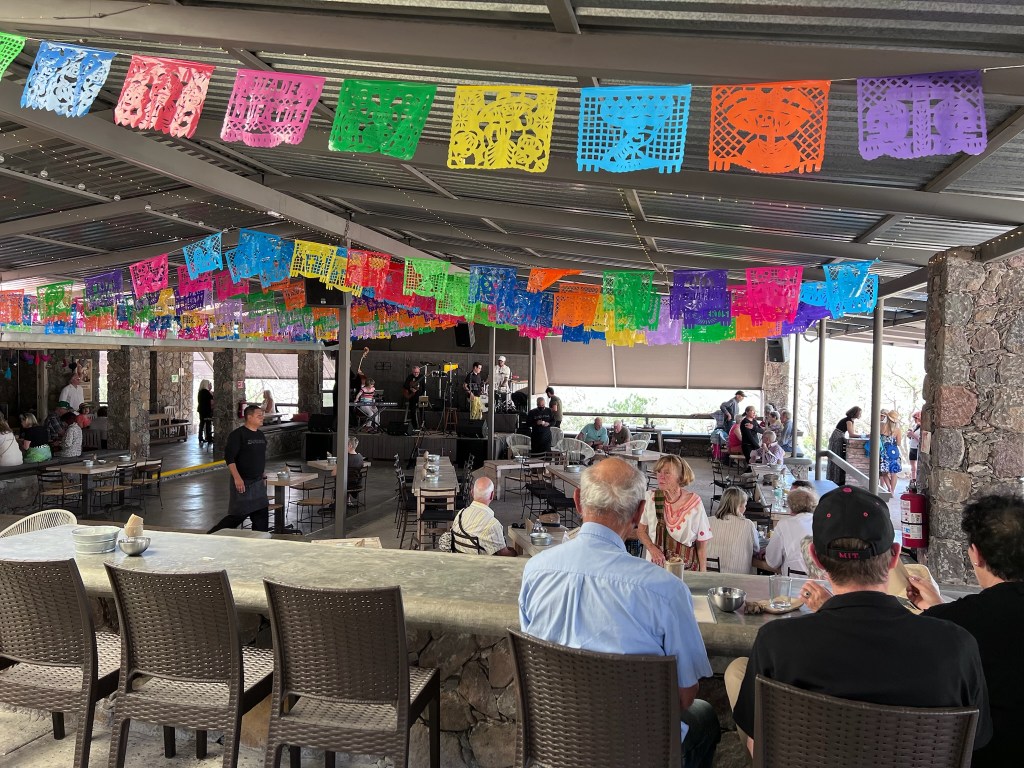 The venue, the food, the music, the drinks are lovely and lively and loud and NOW! and crescendo across the dry dusty valley under a white-hot sun burning in a cloudless azure sky. A light breeze flutters hundreds of small frilly flags hanging from the roof and the horns cut through the heat and just make the feet move so even the tables of us aging bougie hippies with huaraches and sweat-stained Tilly hats hoping we still have the moves and that table of women of a certain age dressed to the nines coyly looking at who’s looking at them get carried to that place where music IS the heart of Mexico and you forget yourself and just gotta dance (h/t to Tom Wolfe?).