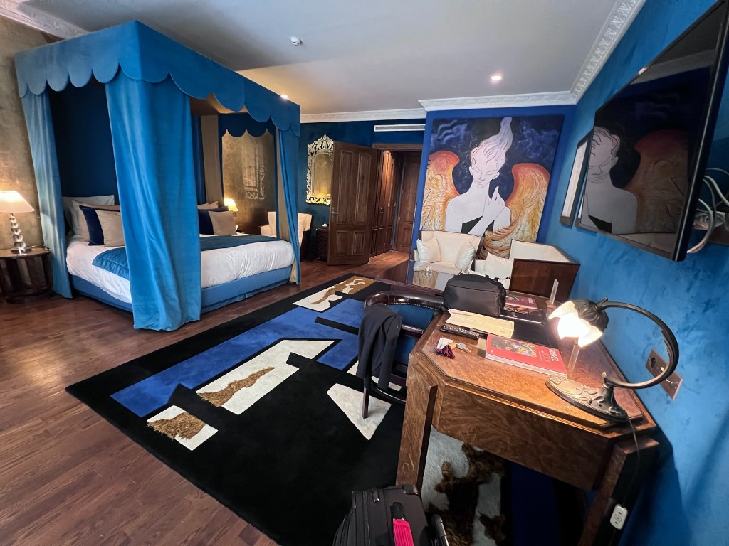 We find our way to the Musee Fondation Abderrahmane Slaoui, check out the collection of posters and decorative boxes, and return to our hotel where snarky Mohammed says, because our assigned room was not ready when we arrived, that he would upgrade us for free to the best room in the hotel: the Jean Cocteau room with a private terrance. It is luscious, sumptuous, wonderful and we are served the wonderful Moroccan mint tea (our preference is “avec sucre”), poured into small glasses from a height of at least a foot — this seems a minimum required maneuver— above the glass. Cynthia pours over various maps and guide books and spreadsheets while David takes a power nap.