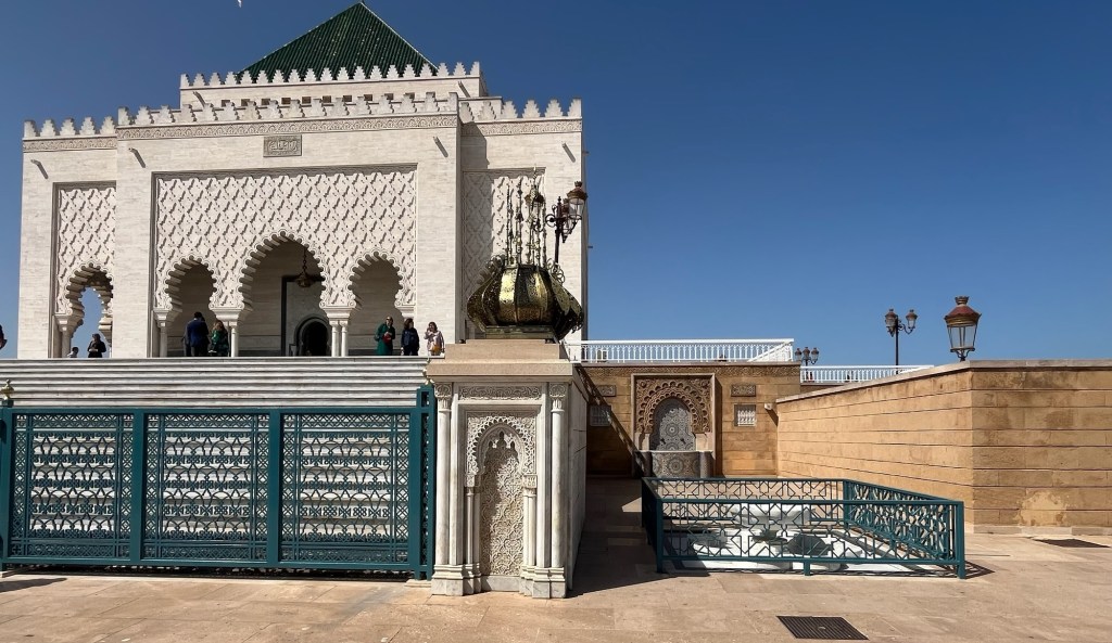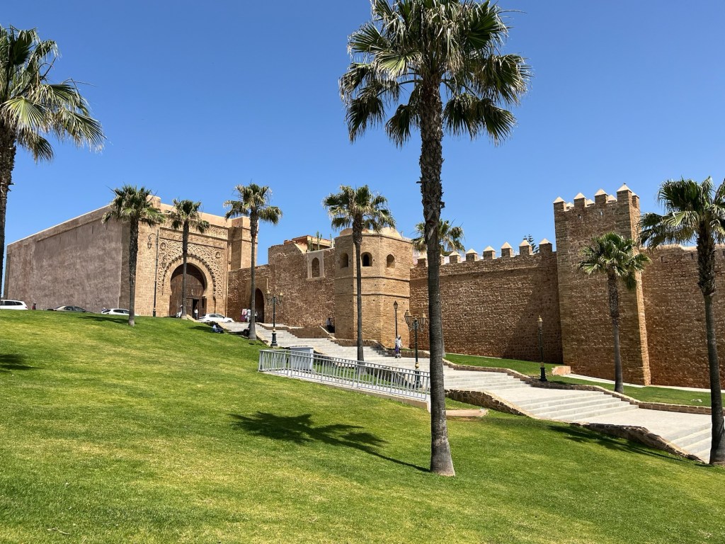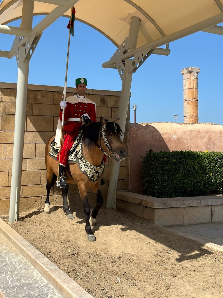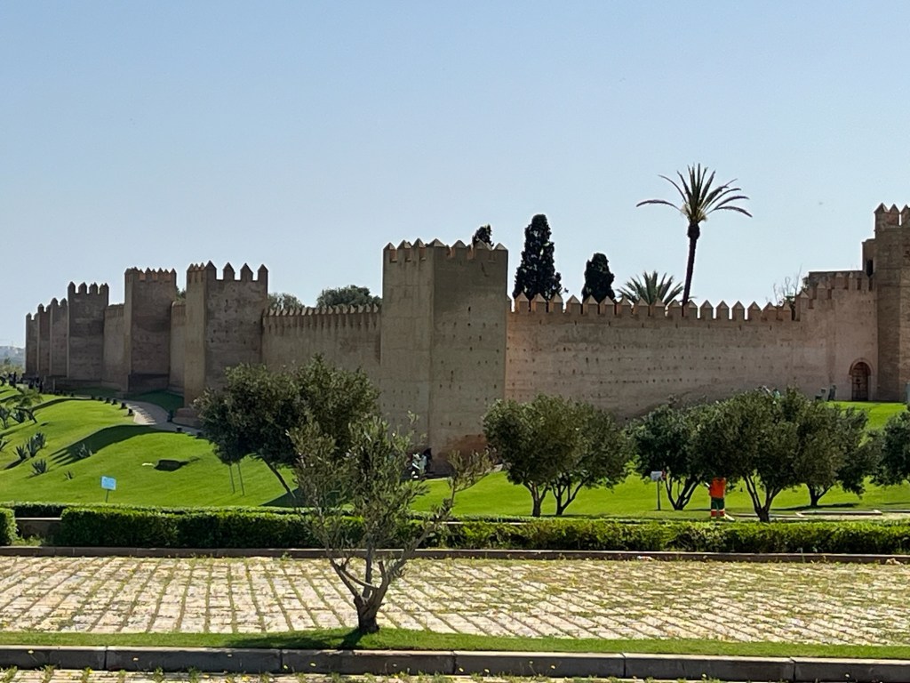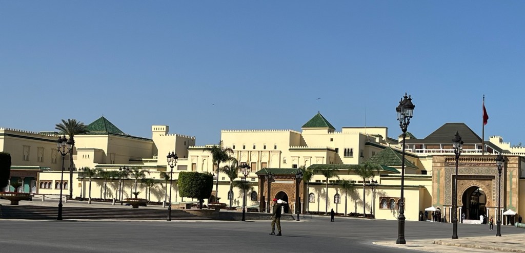After breakfast in our hotel, we’re back on the bus, which takes us first to the king’s administrative palace — huge grounds, single buildings that stretch farther than you can see, lovely manicured gardens, and guards of several services in different uniforms — then back on the bus to see the Chellah (think “fort) with the red-clad dancing drummer outside the main entrance (we cannot go in because it’s still under renovation) — then back on the bus to the mausoleum of King Mohammad V (in a very tony neighborhood overlooking the river and next to a mosque that was Morocco’s largest until it burned to the ground, leaving only a plaza of stone columns next to the 11th century Hassan tower — then back on the bus to have a looooong (IMHO) lunch at the Dar Shan Riad in the medina.