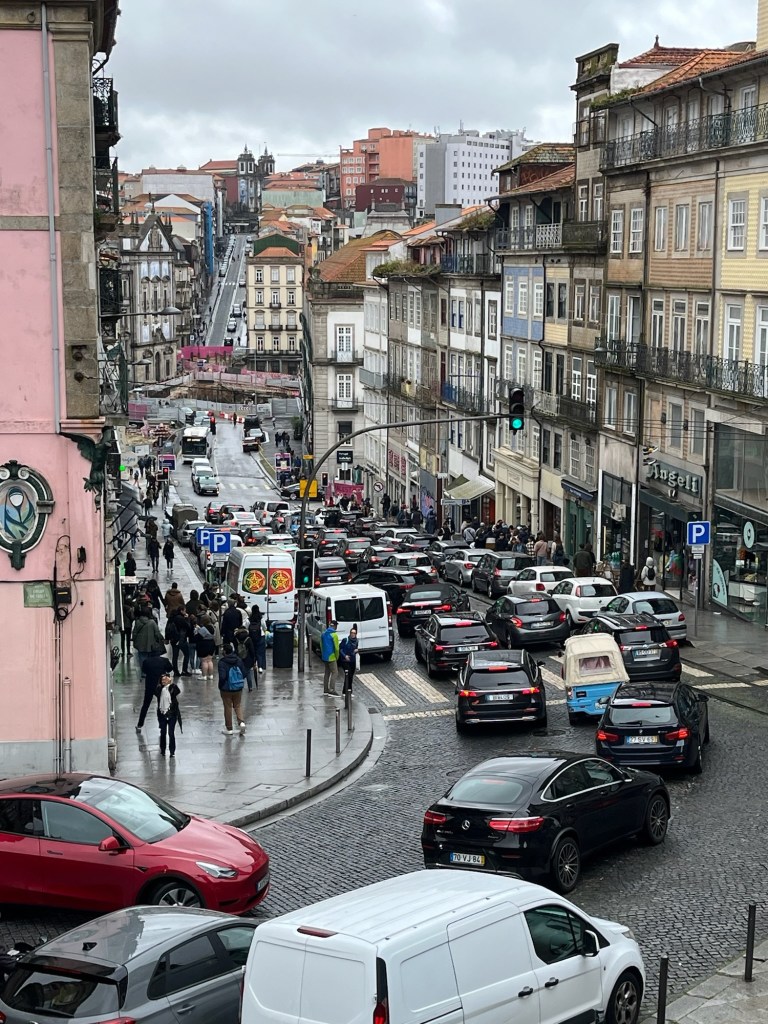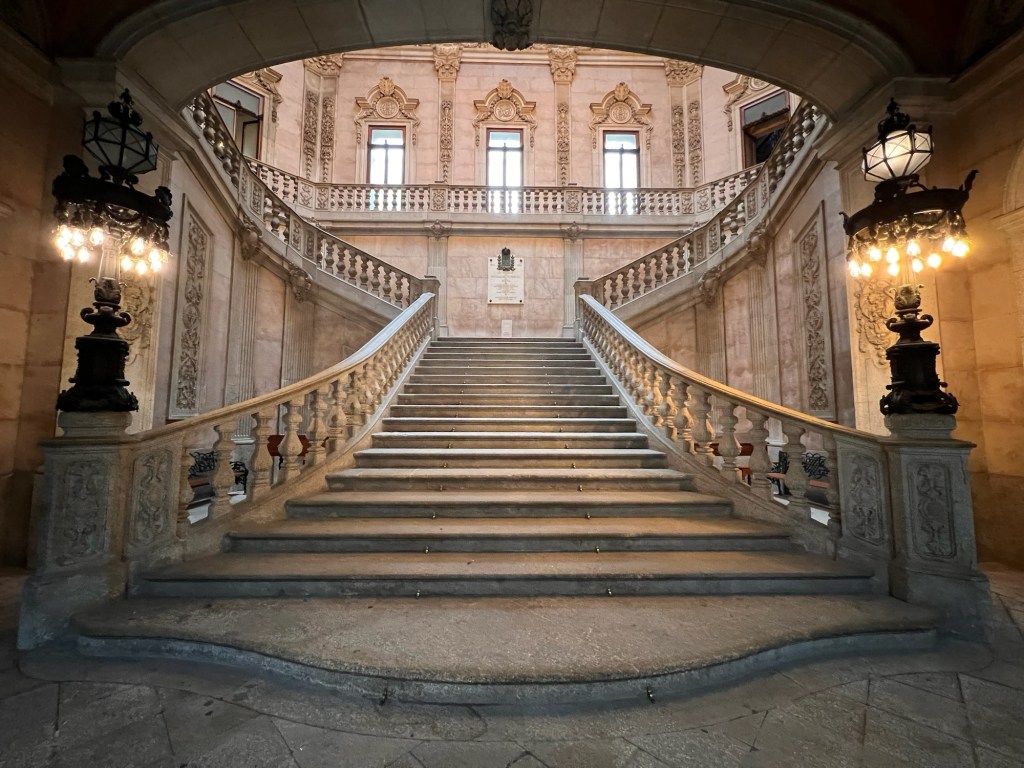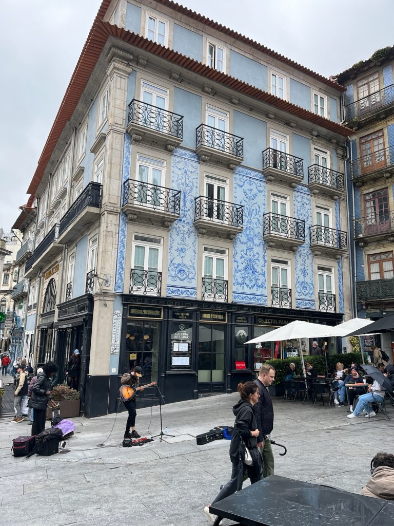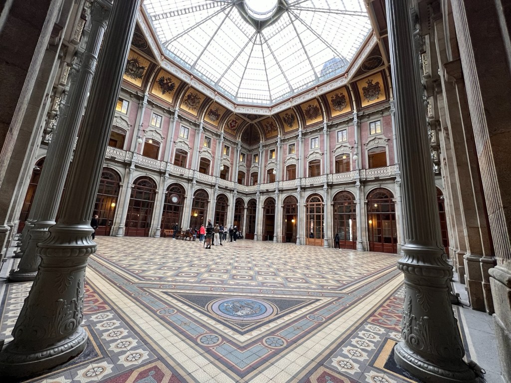 After watching rain scenically drizzle the granite slab sidewalks, cobbled streets and bedraggled Oportians and tourists in front of our window at breakfast, we slip/slide our way to the city’s now defunct stock exchange, hoping for an English-language tour in the near future.