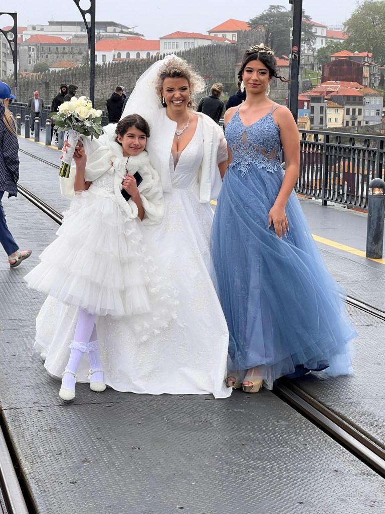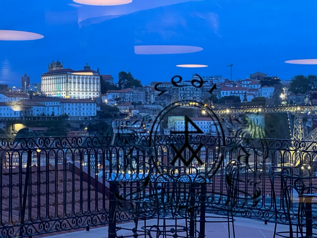 We divide and conquer the rest of the afternoon: David climbing up and over Eiffel’s bridge, almost blown off by 30-knot winds, to the port-house side of the Douro (the side named Novo Villa de Gaia) where an exuberant bride whose dress is almost stripped from her by the wind is having the time of her life doing an outdoor wedding photo op. Cynthia, cases some stores in the streets near our hotel while David returns to the hotel restaurant, gets his first true Negroni of the whole trip to date, and we meet in our room to get gussied up for our “big night” at Taylor Fladgate’s restaurant across the river.