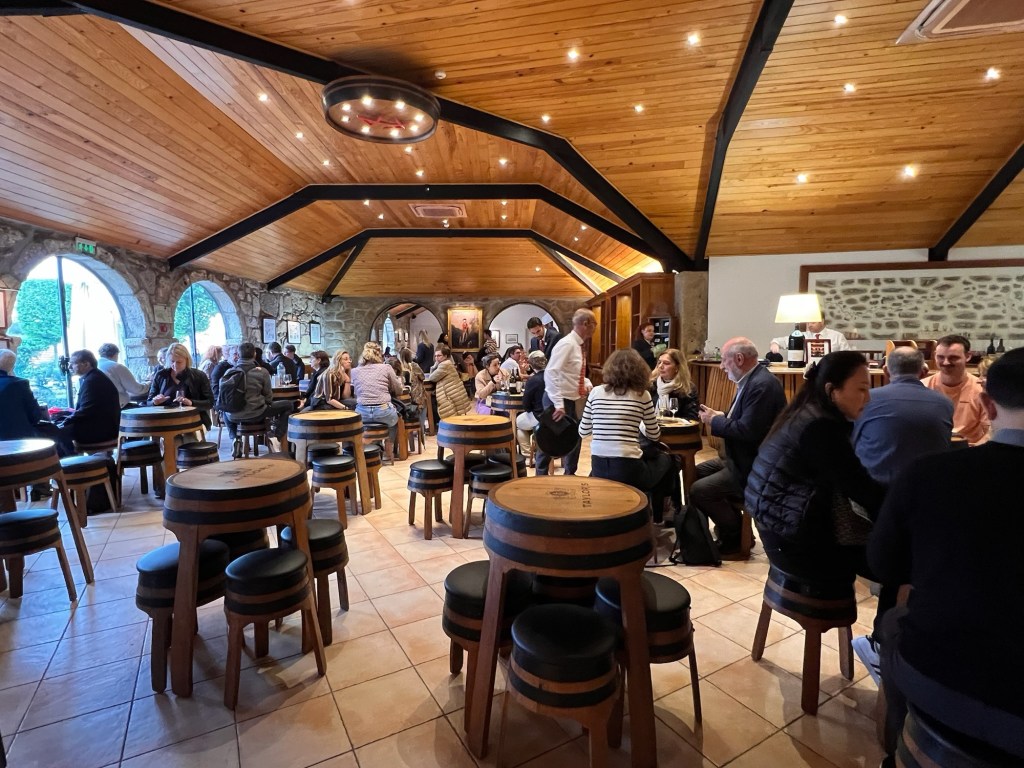 Our uber driver is chatty and … mmmm … political?, philosophical?, slightly preachy? Whatever. Cynthia engages, time passes; we have to go all around Robin Hood’s barn to get to the restaurant because the main bridge doesn’t permit regular cars (nor Ubers) until after eight PM. But we get there and squander some extortionate=usage-fee-ATM-purchased Euros on a port spree in the tasting room for Himself’s upcoming birthday. David loves it when Cynthia splurges, an occurrence as startling as Hyakutake’s 70,000-year orbit.