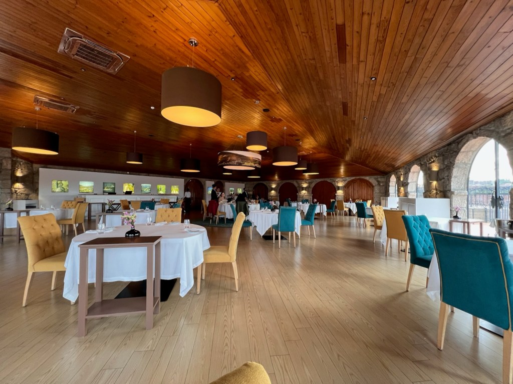 We get the best table in the restaurant, right in the corner, right in front of the windows looking over the bridge and Oporto and realize that that huge white structure that looms over most of the city near the bridge, like the cathedral on Toledo’s central hill, is the bishop’s house. Our sommelier gives us nice advice on the pairings throughout the meal and, while Cynthia’s not stunned by her food, David is totally gruntled by his maigret of duck.