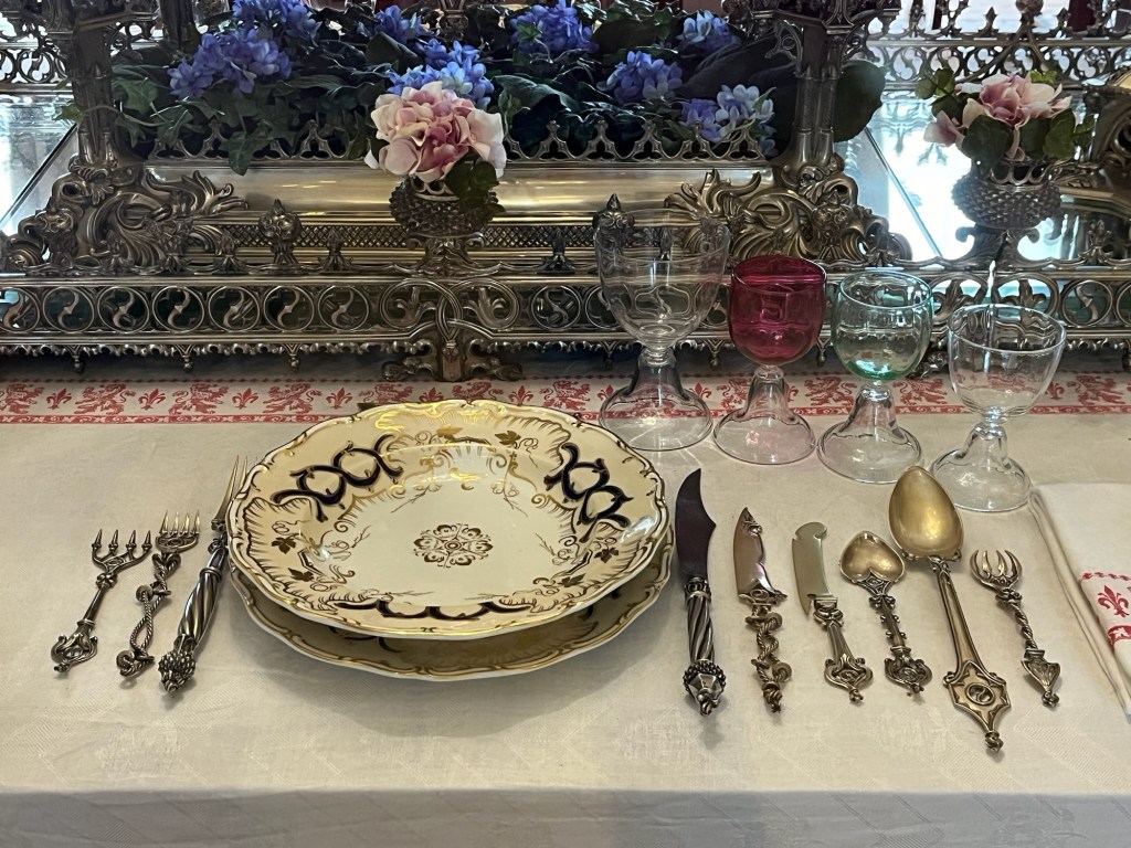As we walk through the rooms, we can see rain coursing down the central glass skylight and wonder how much longer it will continue, how much to prolong our indoor sojourn. Sooooo, we decide to check out the small gift shop at the end of the tour and Cynthia makes a find: a round stainless steel circle with an articulated “tail” that wraps inside it. Unfurled, the tail swivels to hang down as a small hook for a purse or small backpack while the steel circle sits firmly on the table, kept firmly in its place by the counterbalanced weight of the hanging part. She gets a couple but, unfortunately, we can’t dawdle more and, with Rick Steves map and directions, force ourselves outside and into the northwestern portions of the city under a steady drizzle.