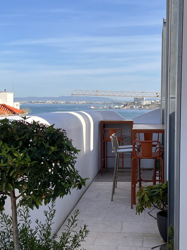 We download Bolt, the alternate Uber app, and summon a car whose driver apologetically winds through New York City levels of construction around the train station and harbor, heading ultimately northwest to an old section of the city where our apartment building has joined the French Embassy and other apartment buildings being renovated to the nines. WOWZER! Anne-Charlotte and Noe Saglio’s two-floor digs are a modernist, pristine dream with a long balcony that looks over the River Tagus, which looks almost as broad as the Chesapeake Bay.