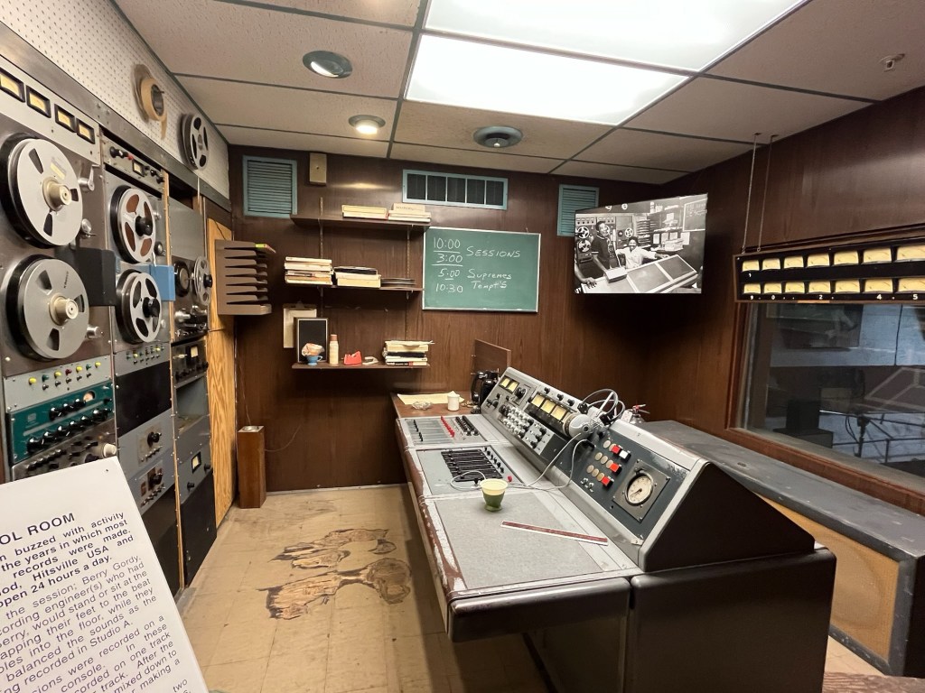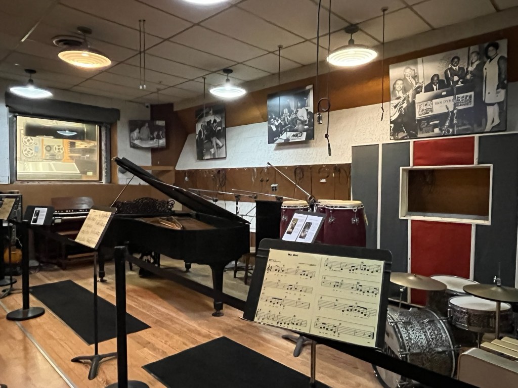 Photographs and artifacts aplenty. We highly recommend any traveler to make the effort to see and hear this crammed, vibrant place a good bit north of downtown Motor City. We finish the tour in “Studio A,” a small basement room crammed with instruments where many of Gordy’s hit tunes first were crafted. Our own Aretha sings a final song with tears glistening on her cheeks.