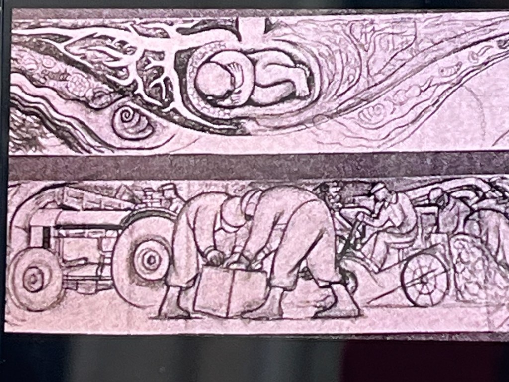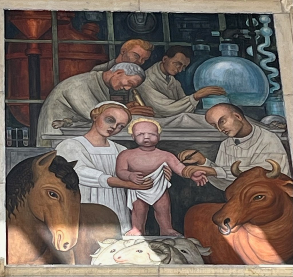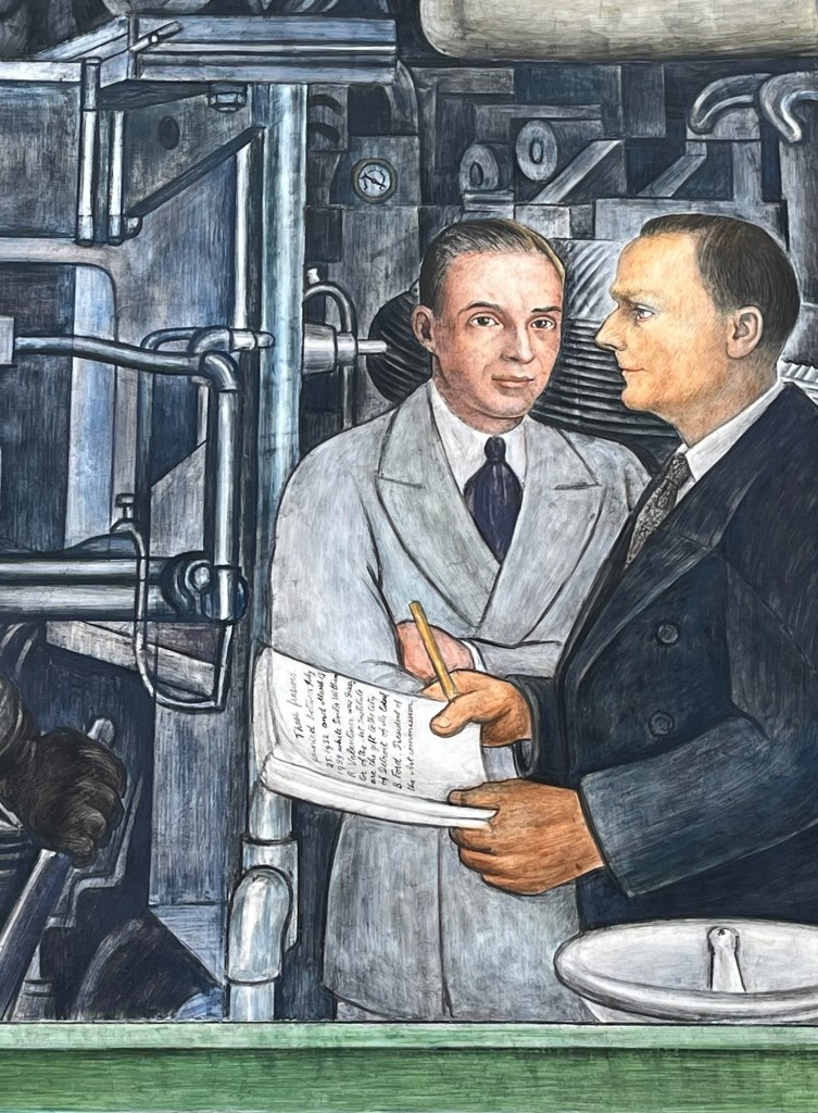 A new and very large museum has broken ground literally behind the original house. In pictures, the new museum looks like a low golden cube. It will be ready, we are told, in 2026. We have little time to ponder this future because we have a one o’clock (two o’clock, three o’clock rock) tour of the DIA — the Detroit Institute of Art, which holds a ton of eye candy and history, including two massive Diego Rivera murals. And we need to get a bus to take us there.