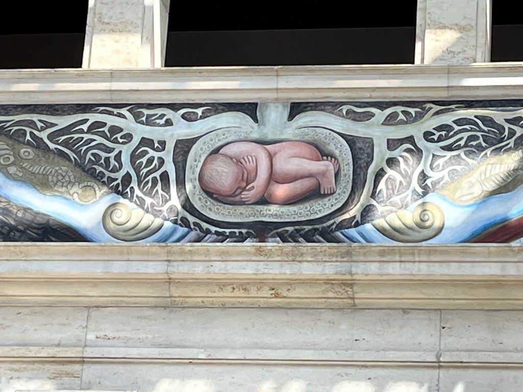 We spend a looooong time in front of Rivera’s murals. Soooo much fascinating about them; you just gotta go. A few facts: His wife Frieda was pregnant and lost her child as he was creating the murals so he changed his design and substituted their unborn child in place of the workers opening the box.