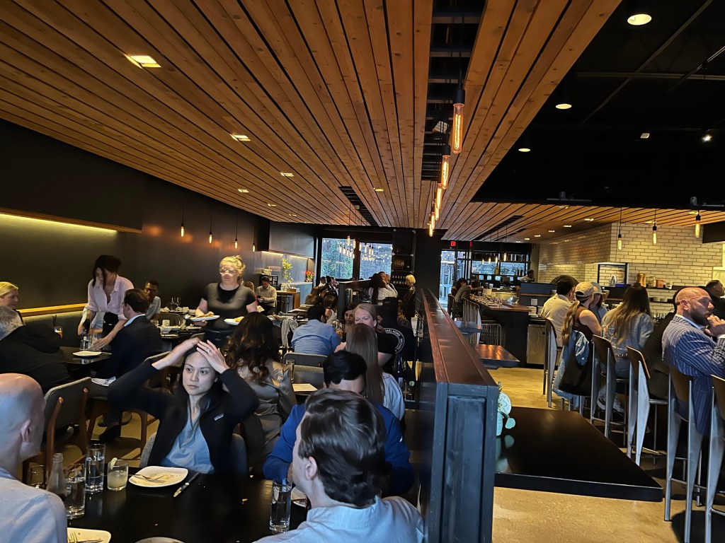 We bus back up Woodward for pre-dinner drinks at the Ghost Bar in David Whitney’s mansion (haunted, hence the name), but are turned away due to a private event. Not a catastrophe and we stroll along some neighborhood streets to get to our destination dinner spot: Selden Standard. As you may see in the photo, the place is decorated minimalistically and, though we are a tad early — ’cause no drinks at the Ghost Bar — it fills completely ricky-tick quick.