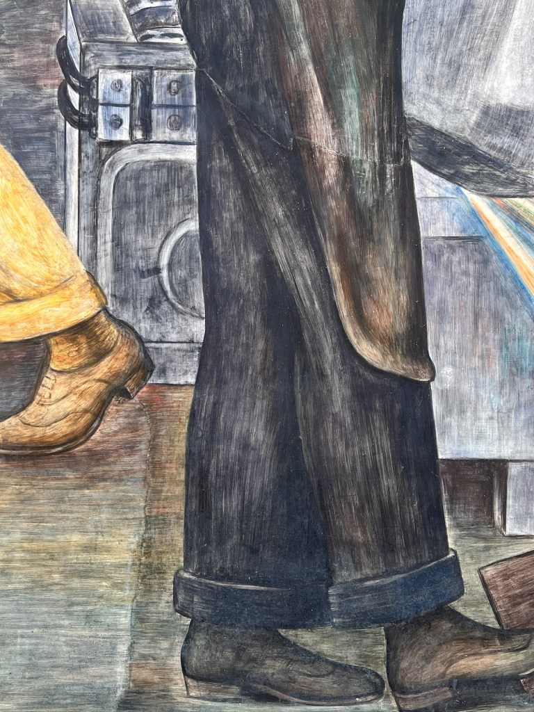 We get to the DIA with enough time to check our bag and break for the bathroom. Our tour begins in a large entrance hall next to the Diego Court where Rivera painted his “Detroit Industry” murals during the 1932-1933 depression years. We have a choice of one of two guides: a local woman or a transplanted Mexican named Miguel who instantly rhapsodizes about Diego’s Mexico City murals. (You guessed right.)