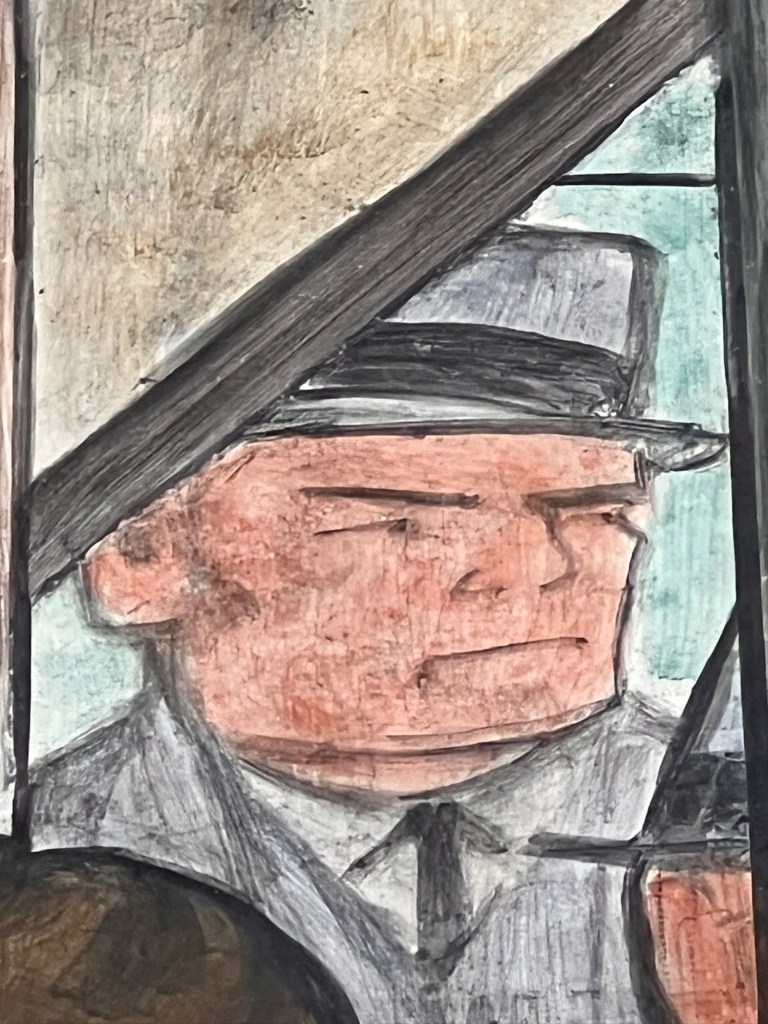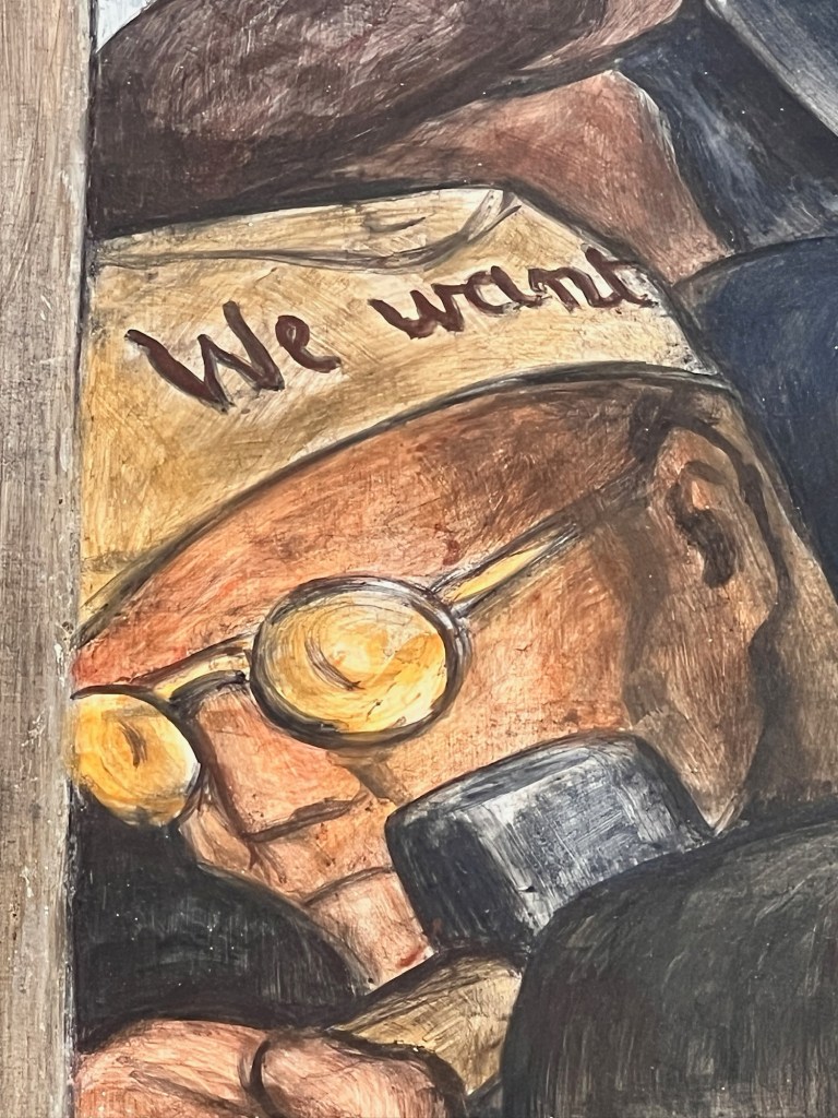 He included the highly controversial panel of the kidnapped Lindberg baby (getting a vaccination … ahem …) with Jean Harlow (as Mary?), the DIA director (Joseph?) and famous scientists. He liked comics so he painted in Dick Tracy and the Katzenjammer kids. He appreciated a good beer so the “We Want” is a worker’s plea for some suds during prohibition; he painted the murals in 27 different sections so he had to mix new paint every day (hence the seam behind the pant leg).