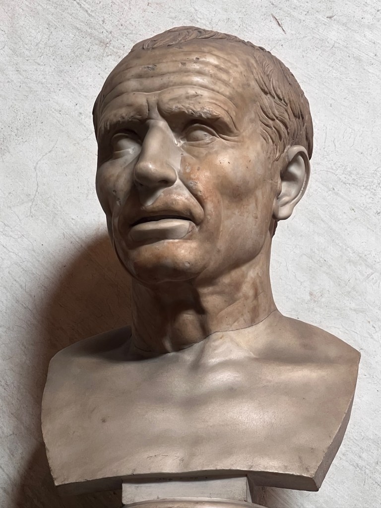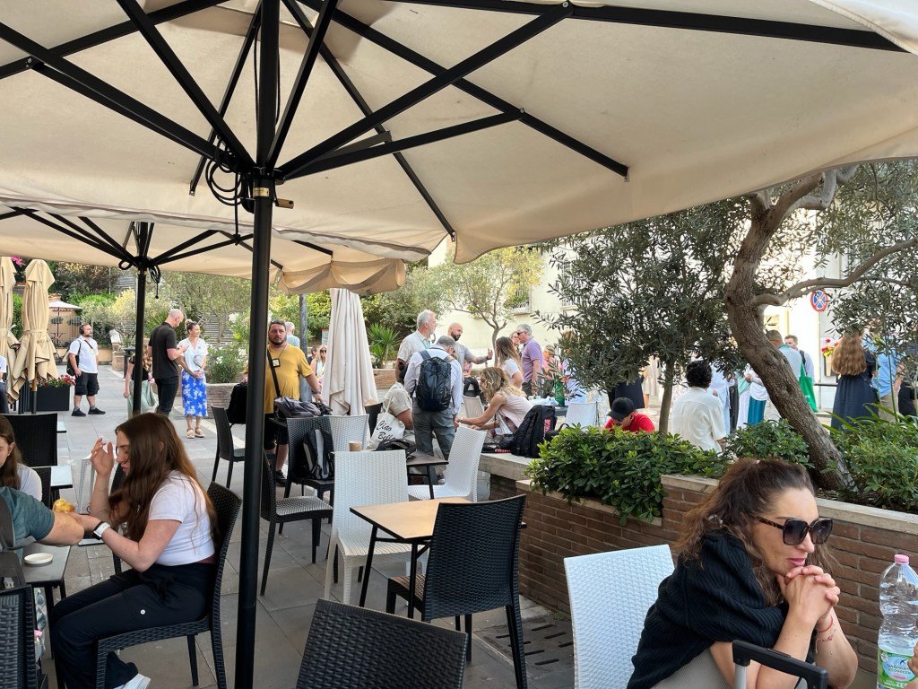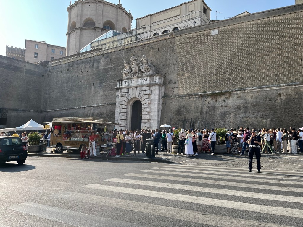Alarms at 6:20 in the morning when you’re 77 are simply … required … if you want to see the Vatican Museum uncrushed by humanity short of getting a personal tour by Robert Francis Prevost. We wake and literally get a call from our scheduled taxi driver as we’re in the elevator down to our street. Which, of course, is blocked off from traffic so one of us has to run in his boot to the end of the street where our taxi awaits. We make it and 15 minutes later are dropped off at Cafe Candi near the Vatican City walls outside which large groups of people with various colored stickers saying “the walk” mill about feeding pigeons from their croissants and sipping tiny paper cups of espresso.