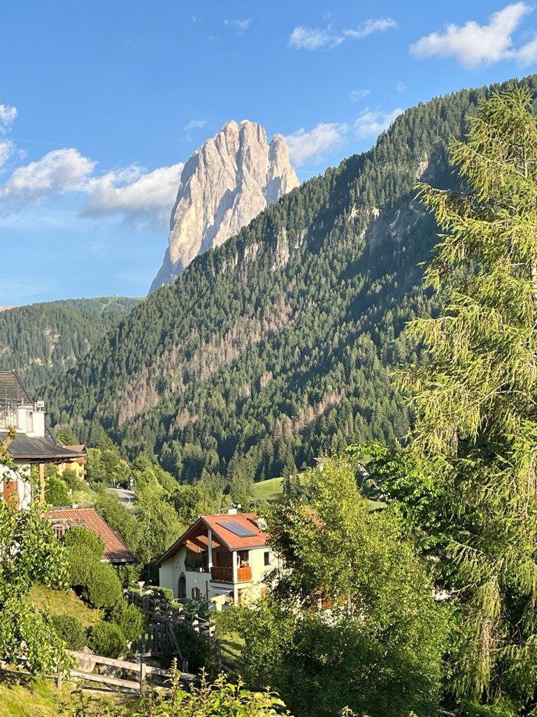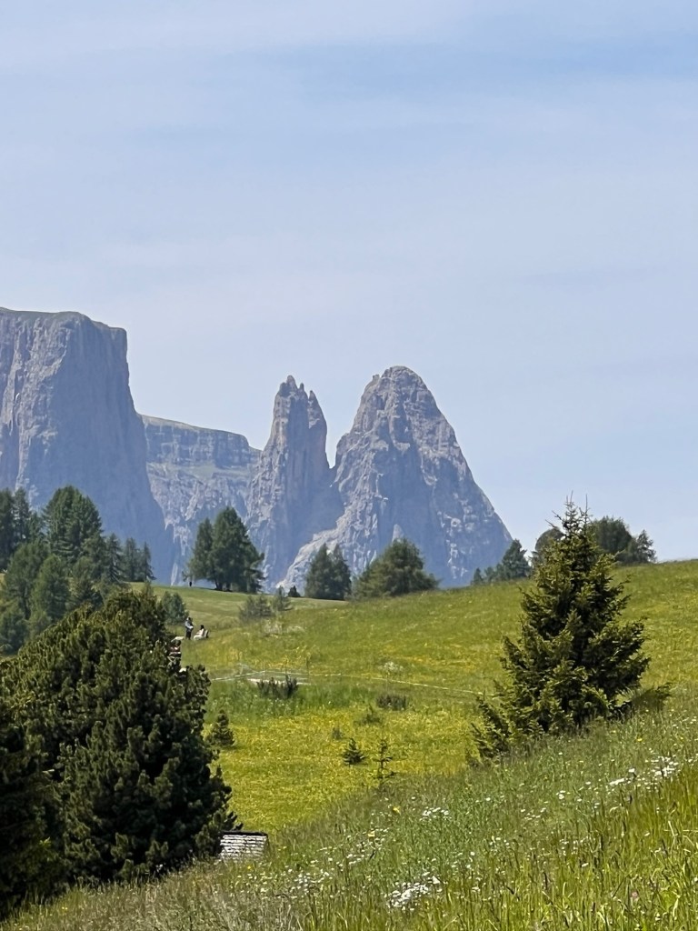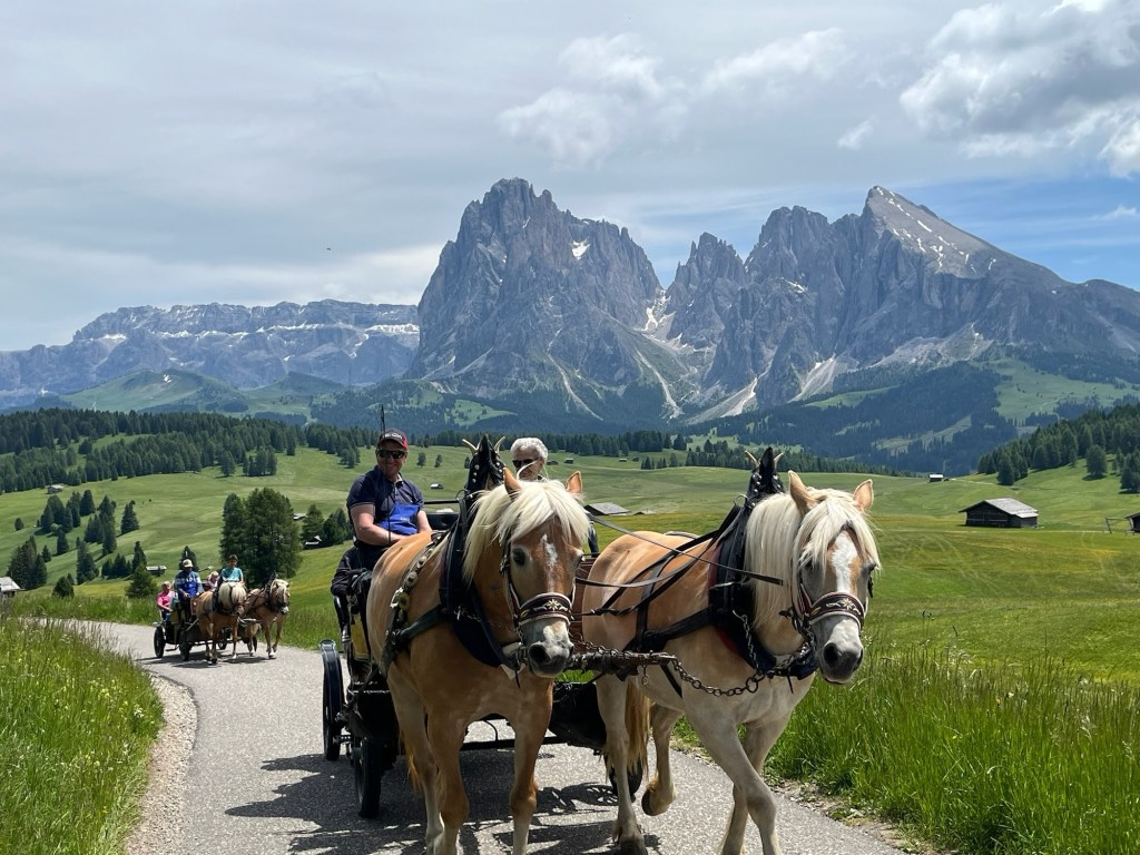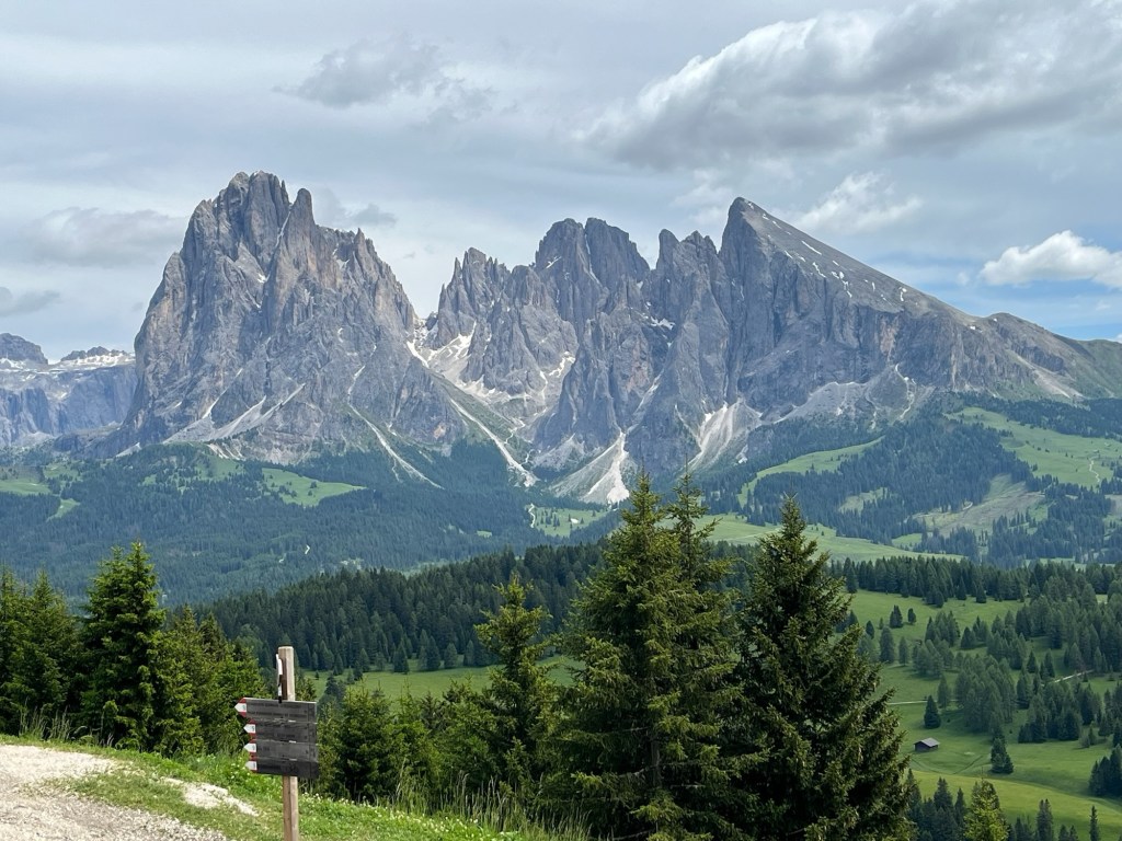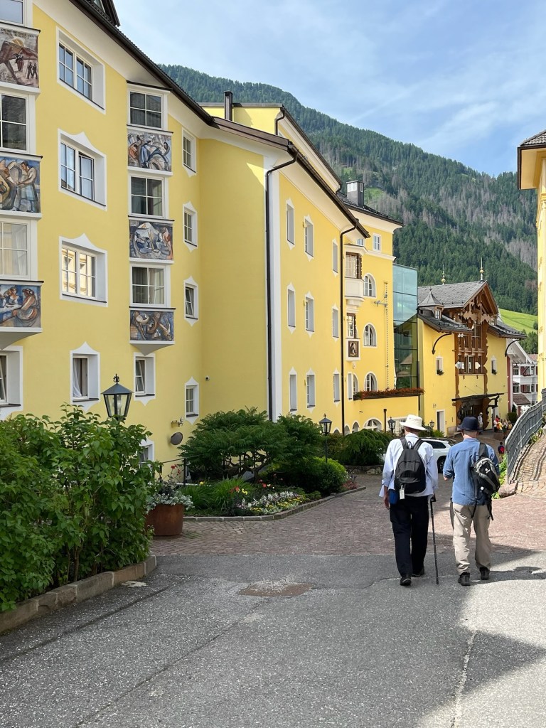 We group with Darrell and Nora at an outside table and do some planning — the rose farm tour? The alpaca farm visit? The tree hugging walk? The wood carving instruction? Etc. We consult a woman at the reception desk who tells us that we should not over plan. She said that if we have 3 beautiful walks we will have had a wonderful visit. She is conscious of David’s leg and says one cannot break off from the 5-6 hour guided hikes. She suggests we go on our own to Seiser Alm/Alpe di Suisi for our first day. It turns out to be a great suggestion.