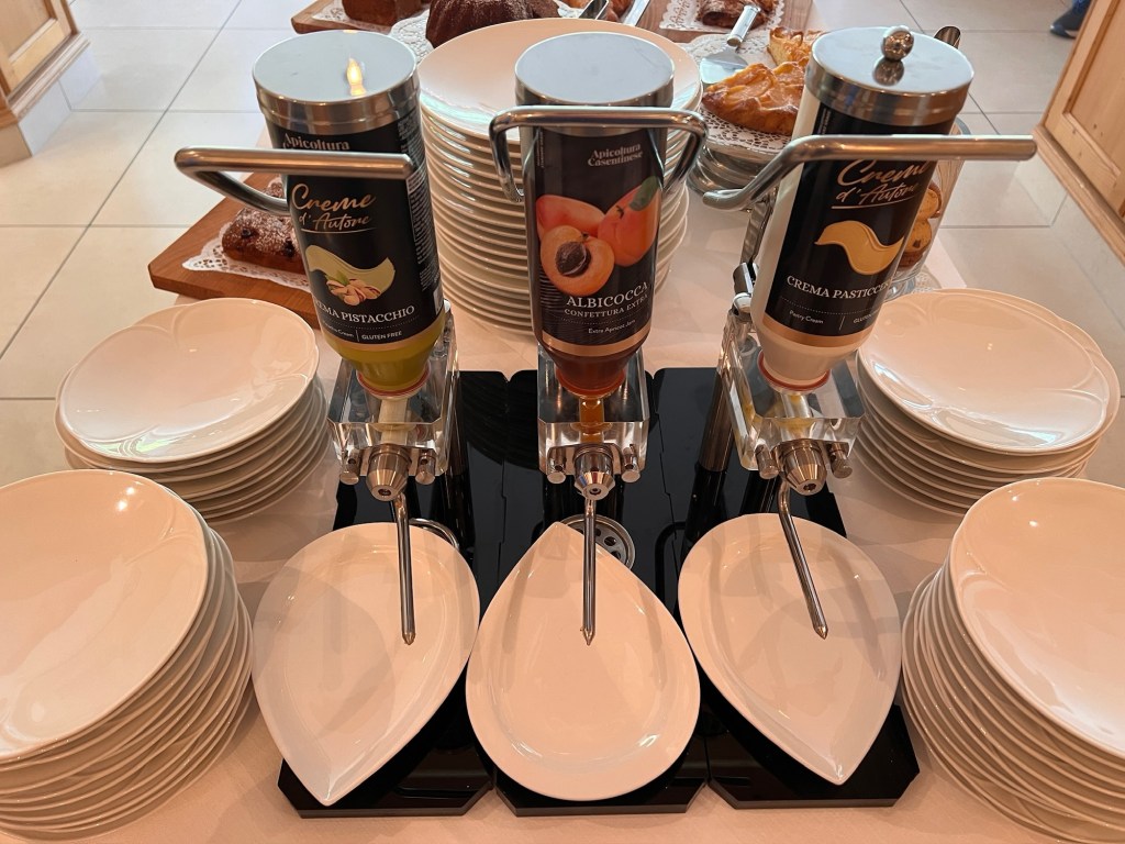 Breakfast is self-service on tables that include several varieties of fruit, cheese, breads, eggs, bacon, muesli and a three-jet croissant injector if you want to insert pistachio, apricot and/or vanilla creams into your croissant.