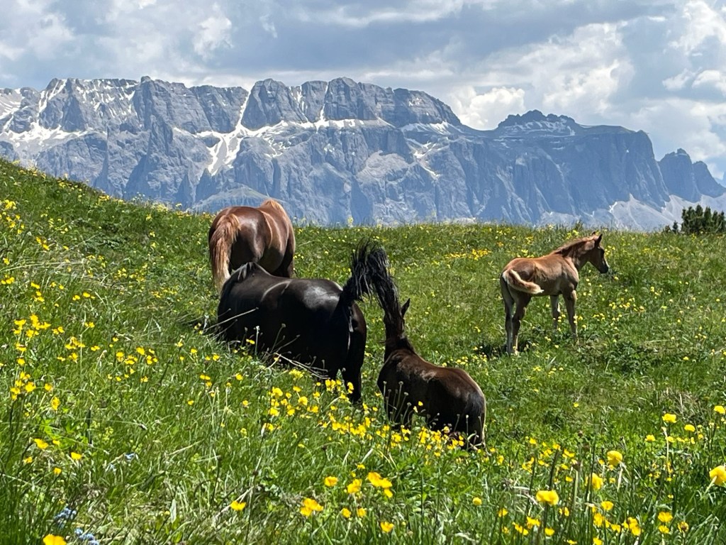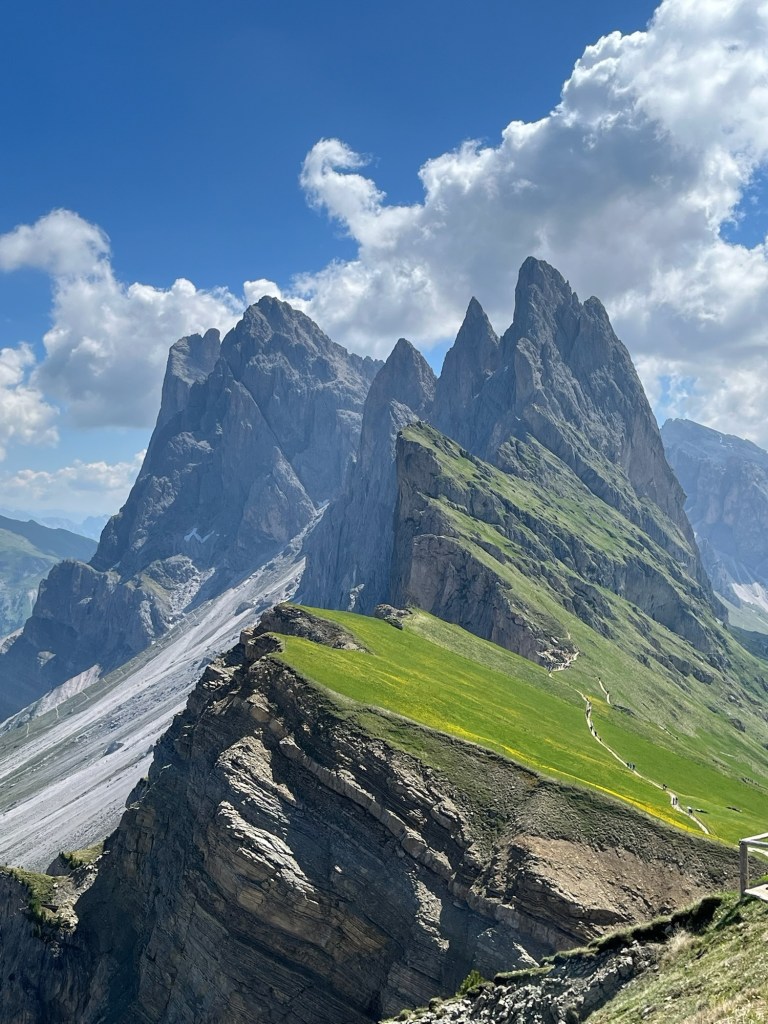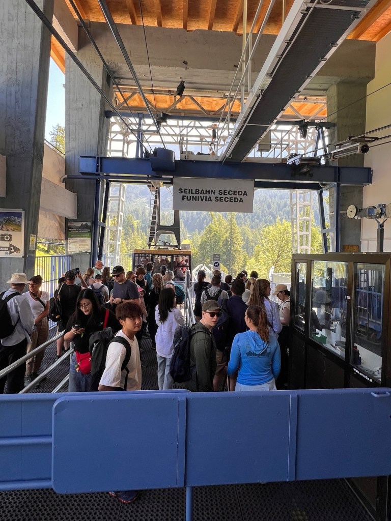 We select the day-long two-gondola (lift numbers 4 and 5) ride to Seceda, where we take half-a-million photos and tramp on trail 2B to a lookout point named Furcela Pana. Yet again, we won’t try to describe; just look at the photos that don’t do the views justice because the immensity of the distances and weights of the rocks simply cannot be captured in photos compared to the “real thing.”