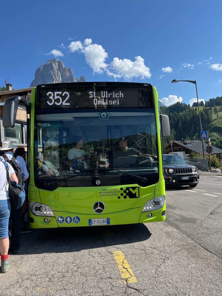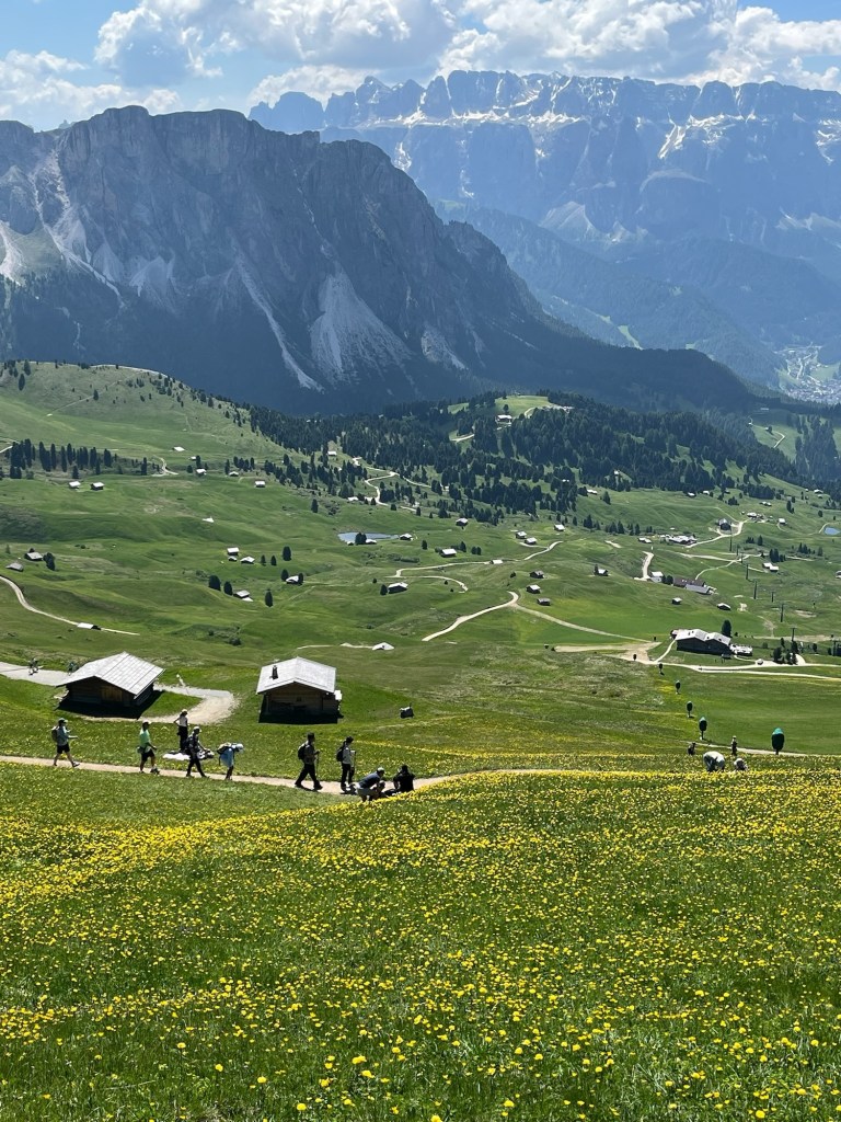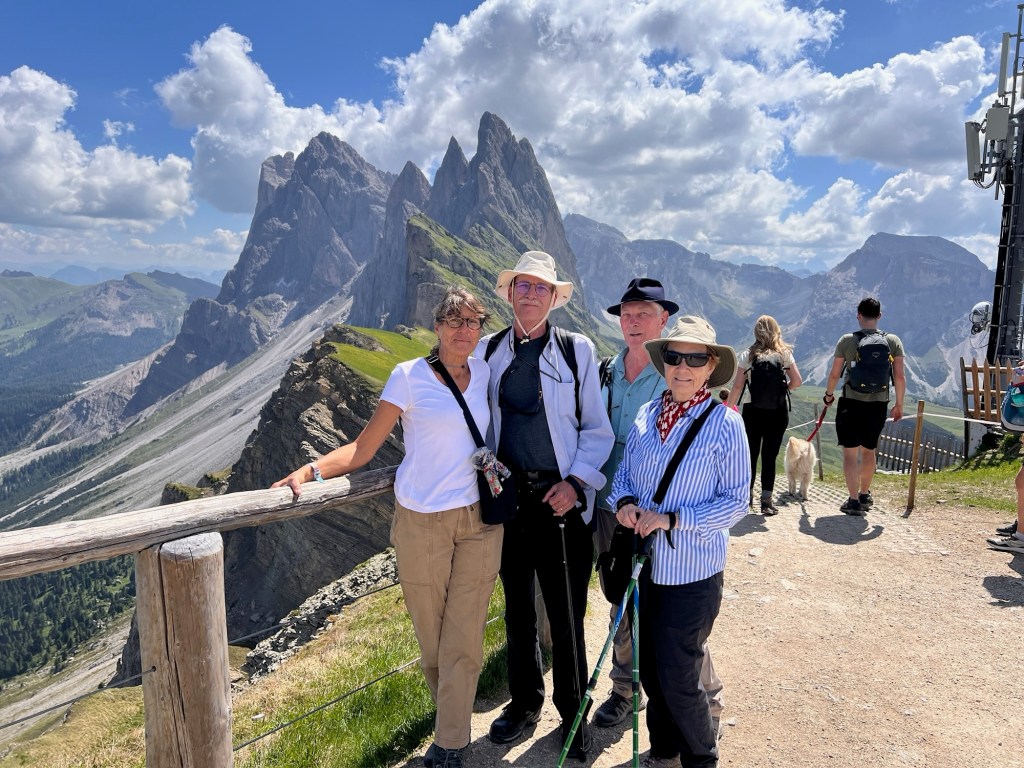 We ablute, check our clothes drying on our balcony furniture, and meet Darrell and Nora for breaky in the dining room. A waitress both immediate and kind asks what beverage we would like and leaves to make cappuccinos, espressos and tea. Aquamarine blue sky and 76 degrees at 8 a.m. The Bristol couple have let baby Ivy crawl around and drool on the floor, and we start pouring over a map of our immediate Val Gardena to suss out today’s hike.