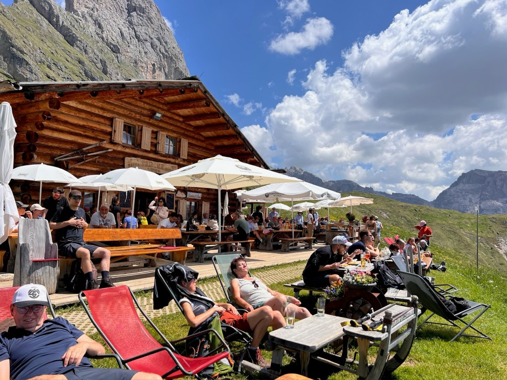 We stop at the Firenze Revensburger hut with dozens of polished pine picnic tables under white umbrellas and order grilled sausage with fries to share, Aperol spritz, espressos etc. A stout fellow with a “gnarly roadie” appearance walks by. His black t-shirt reads “Who the fuck is Mick Jagger.” We can’t figure out the intent, so Nora demurely yells, “What’s your t-shirt mean?”