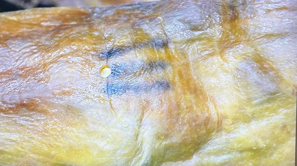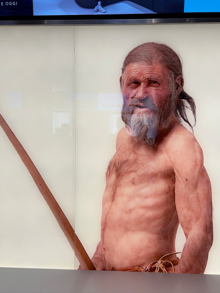 The exhibit is about 10 times more interesting and comprehensive than we expected: very informative signage in English tells us about the geology of Otsi’s time, the climate, social structure, etc. The info about him and his trappings — clothes, bow and arrows, quiver, tools in a pouch — is extensive. As is the story of his murder by arrow and blow to the head (possibly not simultaneous). Why?